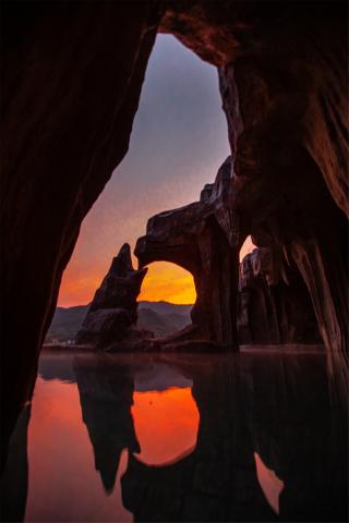 ▲洞穴柱子形成的人像剪影,獨具巧思。@錢山金湯溫泉體驗館