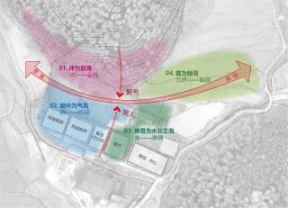 在對場地進行了實地勘察之后,我們認為,金湯溫泉其高品質(zhì)、極具醫(yī)療價值的天然泉水一方面能予以人生理上的“治療”;另一方面,生態(tài)、樸實的場地環(huán)境能予以人精神上的“治療”,因此,在設(shè)計上也應(yīng)符合“健康、自然”的感受。而我們由場地溪流聯(lián)想到,將場地中的人流動線比作人體脈絡(luò),將中醫(yī)“四?!钡?概念運用到分區(qū)活動的布置上。