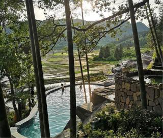 ▲疊泉區(qū):充分利用山坡高差做疊水,沒于竹林中,幽靜隱逸。@錢山金湯溫泉體驗館