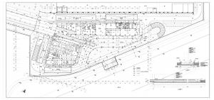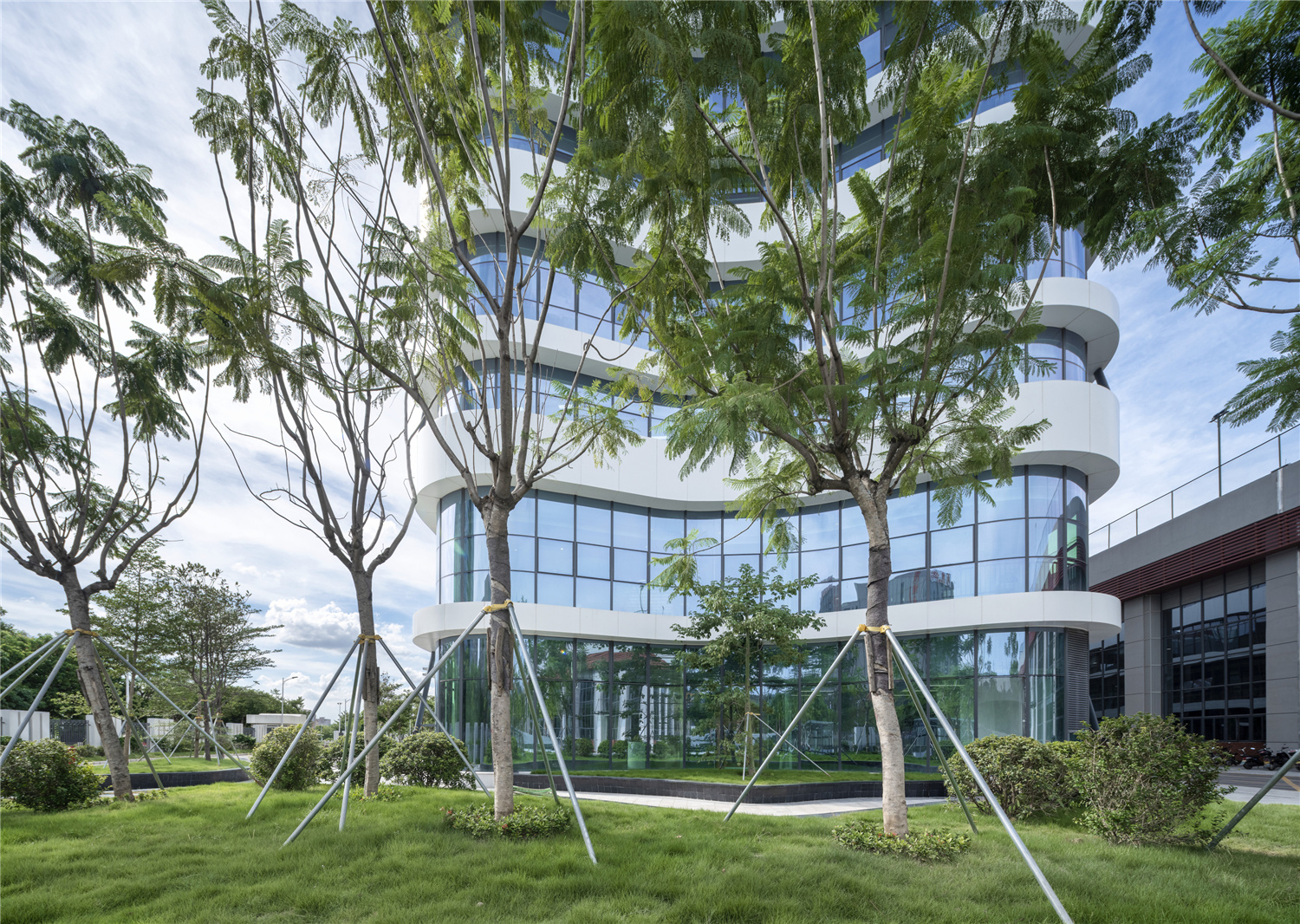 The landcontains Office Building, Canteen, Storage, Multi-Function Hall, Indoor Badminton Court, Staff Dormitory and Police Station.Itis divided by the test line and the wheelhouse, and the complex is placed on the west side of it; the west land is more effective, so the high-rise complex will be more in line with the iconic requirements. The dormitory with a certain independent function and the attached building block of the police station are located on the east side of the land. The two are both connected and relatively independent. At the same time, in order to display the elegant and dynamic architectural image, the proportion and functional area of the original complex and dormitory are adjusted.Also the building area and height of the complex are increased, making the building more upright and dynamic.