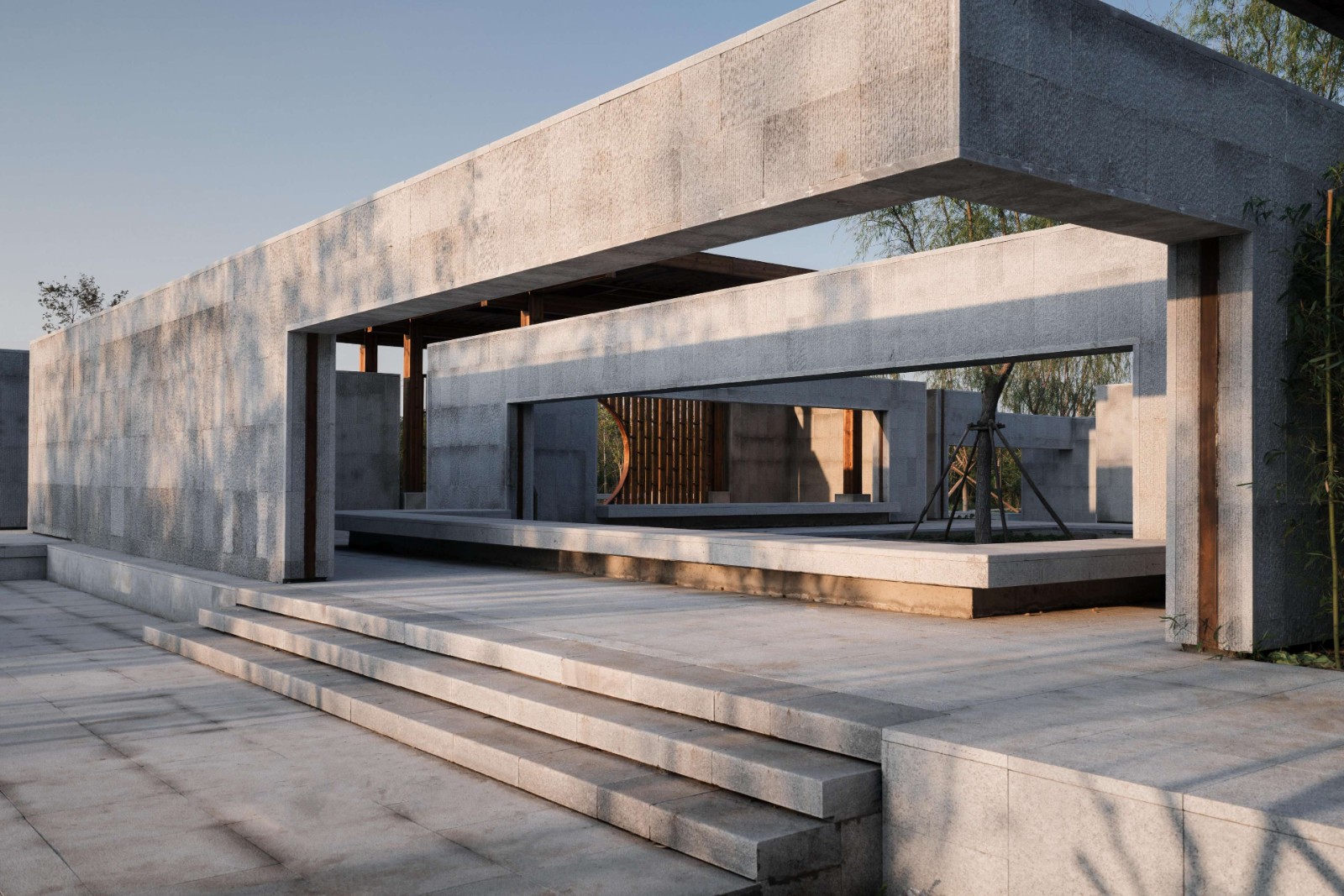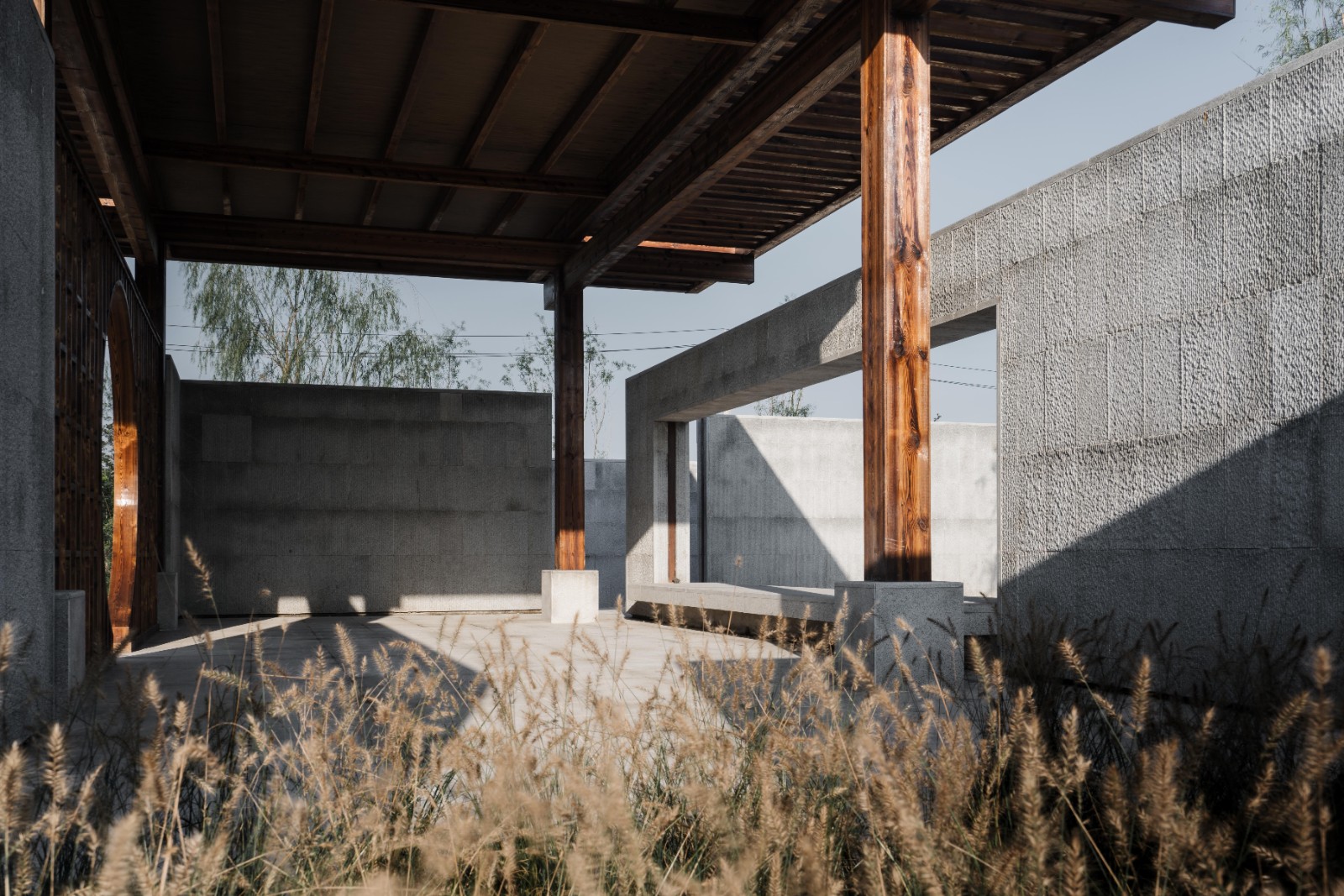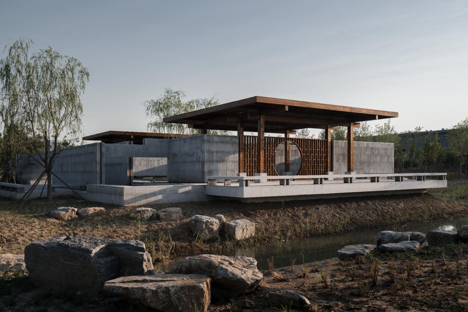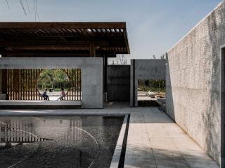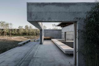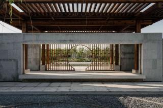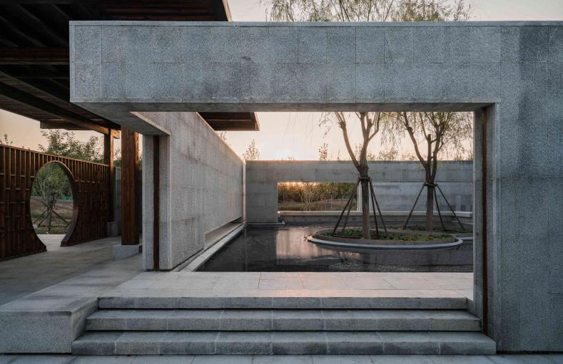 廊架和水榭兩者都采用了相對樸素的梁柱搭接做法,強調(diào)水平出挑,意圖創(chuàng)造高挑平展的檐下空間。同時我們在廊架與水榭的雙柱間設置了博古架月洞門,它們不僅給整組建筑加入細節(jié),同時在文化符號層面與傳統(tǒng)意向建立聯(lián)系。最簡單的梁柱方亭呈現(xiàn)的空間既非完全的內(nèi)部,也非完全的外部,而是將內(nèi)與外匯聚于一點,水榭與廊架為整組建筑建立了中軸線上的正面性,面向自然并將風景吸納進構筑的虛空之中,讓風景與構筑在屋頂下、梁柱間的虛空中形成交疊。盡管庭院主要是由墻和墻上開洞界定了面向內(nèi)部的回游空間,但我們在東南西北四個方向都設置了水平延展的、面向外部的平臺,平臺上設置坐凳,這讓整組建筑以正面朝向外部環(huán)境,同時驅動了人在內(nèi)與外之間的回游與穿越,交織與徘徊。