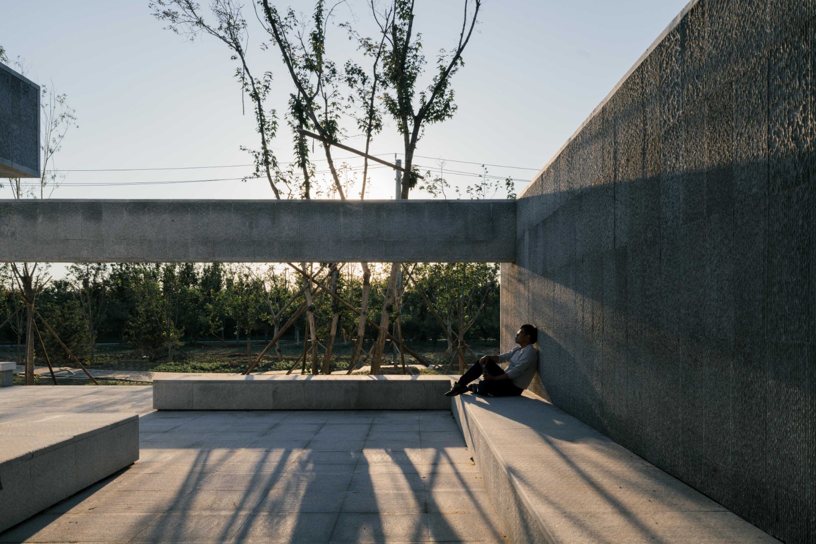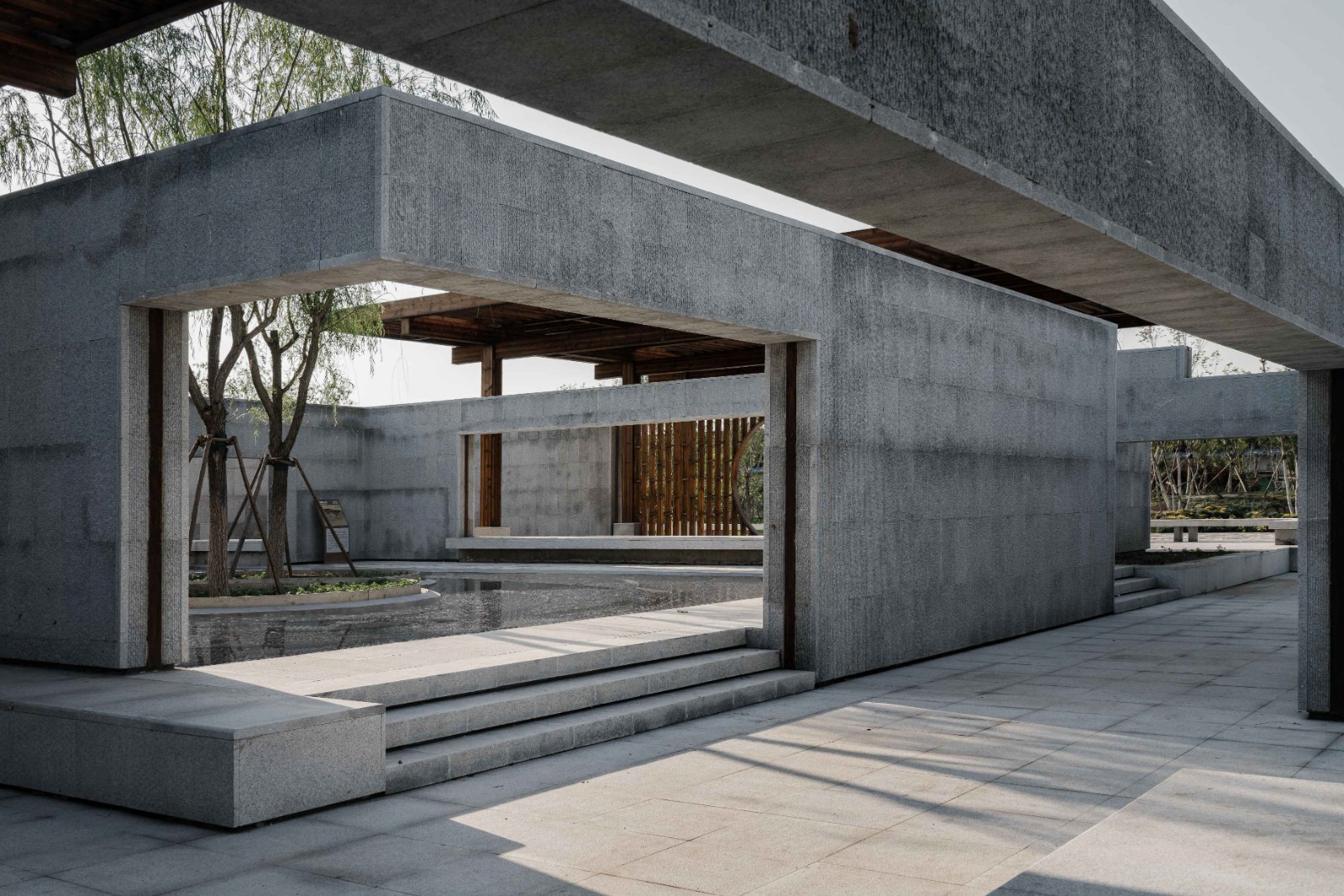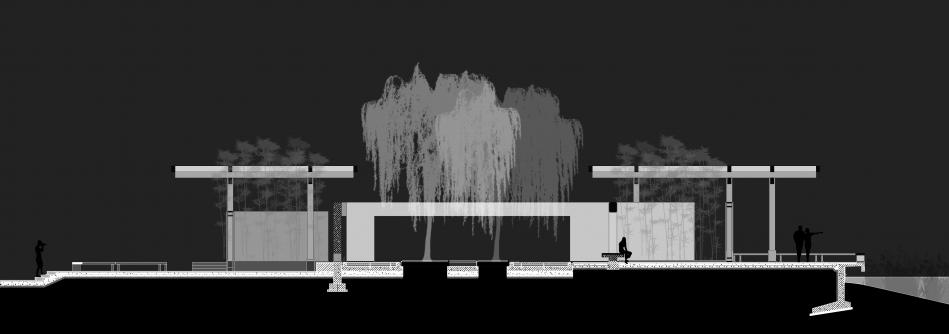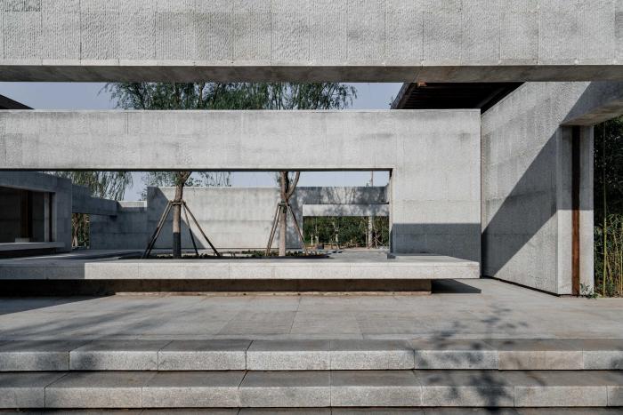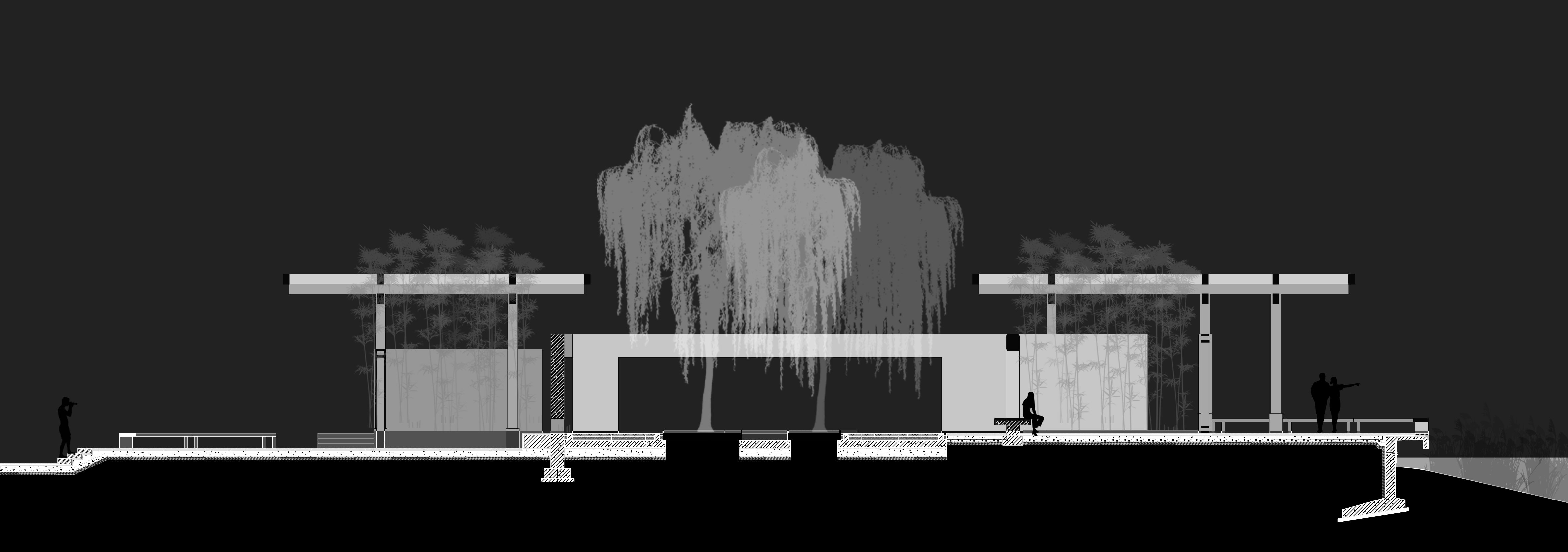 在林間水畔的空地上,我們將我思園組織為一個回字形的一進院落。院落式的布局于林地之中創(chuàng)建了一個“內(nèi)部”,形成一個“園中園”的回游空間。北側向山、南側面水,分別設置廊架和水榭,而兩者之間則以回廊連接。在這一設計中我們將回廊的頂部去掉,回廊簡化為內(nèi)外兩層墻。在平面上,兩組口字形的墻相互嵌套交疊,勾勒出中間薄薄的靜水面,水面中心為同樣相互嵌套交疊的圓形種植池,其中復植兩棵垂柳,垂柳位于整組院落的形式中心與視覺中心,強調(diào)并再現(xiàn)“雙柳樹”的歷史典故?!扒短捉化B”是我們在這里使用的一個平面母題,它打破了“內(nèi)圈”與“外圈”的嚴格界限,使得內(nèi)中有外、外中有內(nèi)。兩層墻之間交疊部分定義的水面空間向上抬起,“臺”與“墻”微微錯動,讓出可以坐人的空間,“臺”與“坐”的界限由此變得模糊。