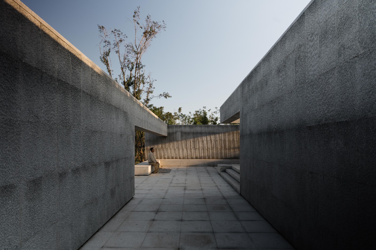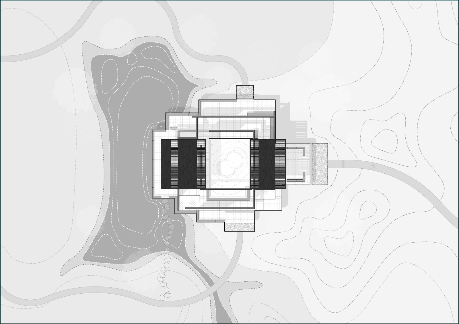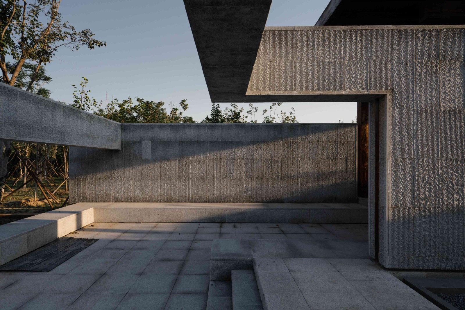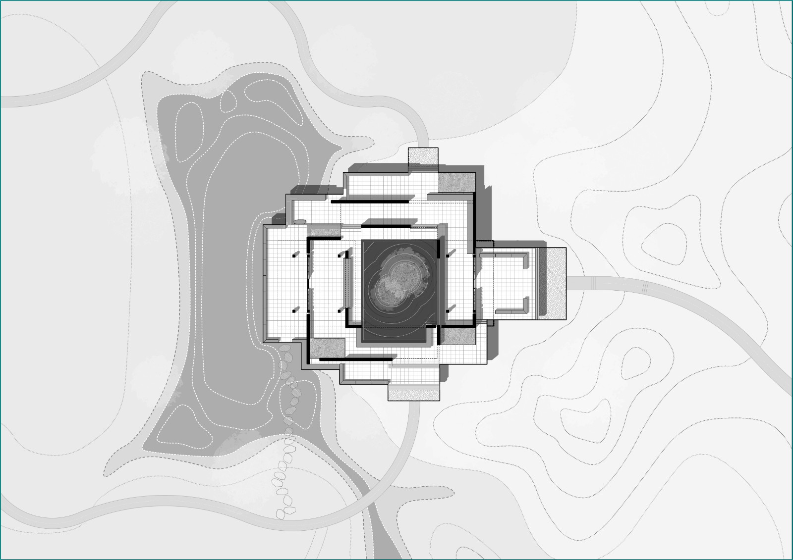 在林間水畔的空地上,我們將我思園組織為一個回字形的一進院落。院落式的布局于林地之中創(chuàng)建了一個“內(nèi)部”,形成一個“園中園”的回游空間。北側向山、南側面水,分別設置廊架和水榭,而兩者之間則以回廊連接。在這一設計中我們將回廊的頂部去掉,回廊簡化為內(nèi)外兩層墻。在平面上,兩組口字形的墻相互嵌套交疊,勾勒出中間薄薄的靜水面,水面中心為同樣相互嵌套交疊的圓形種植池,其中復植兩棵垂柳,垂柳位于整組院落的形式中心與視覺中心,強調(diào)并再現(xiàn)“雙柳樹”的歷史典故?!扒短捉化B”是我們在這里使用的一個平面母題,它打破了“內(nèi)圈”與“外圈”的嚴格界限,使得內(nèi)中有外、外中有內(nèi)。兩層墻之間交疊部分定義的水面空間向上抬起,“臺”與“墻”微微錯動,讓出可以坐人的空間,“臺”與“坐”的界限由此變得模糊。