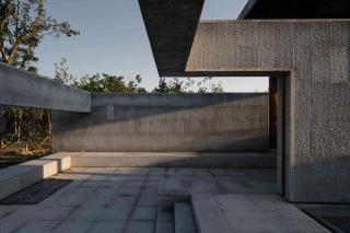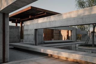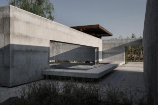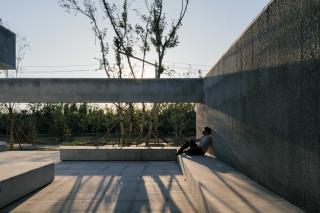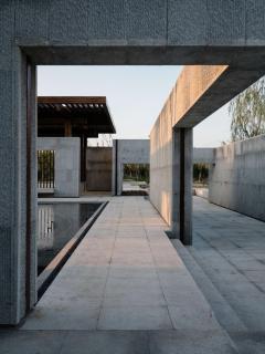 兩層墻之間的空間是院內(nèi)的回游空間,在傳統(tǒng)的園林建筑小品中,回廊通常向內(nèi)敞開,局部向外開洞,使人可以獲得時內(nèi)時外的空間經(jīng)驗。在我思園中,我們通過梁下的巨型開洞來完成內(nèi)部與外部的溝通。超大尺寸的開洞和角部的開洞產(chǎn)生了壓得很低的梁,這些漂浮在頭頂?shù)牧阂环矫娑x了空間的內(nèi)外邊界,形成空間層次,另一方面又促成了一種人從梁下穿越的儀式感。內(nèi)外兩層墻面之上開洞的錯位造成了兩層墻之間的空間緊張感,而這種開洞產(chǎn)生的空間緊張感讓處于其中人產(chǎn)生“回游”的沖動。廊架與水榭中古典對稱的靜態(tài)空間與回廊之中的動態(tài)空間并置在一起,讓整組建筑動中有靜、且坐且游。兩處墻角部立體開洞產(chǎn)生了漂浮在空中的折梁,并形成了梁下立體的虛空,折梁本身強調(diào)了一種轉折處的剖面關系,同時解放了梁下的角部空間,讓視線可以穿透角部而進入內(nèi)部。