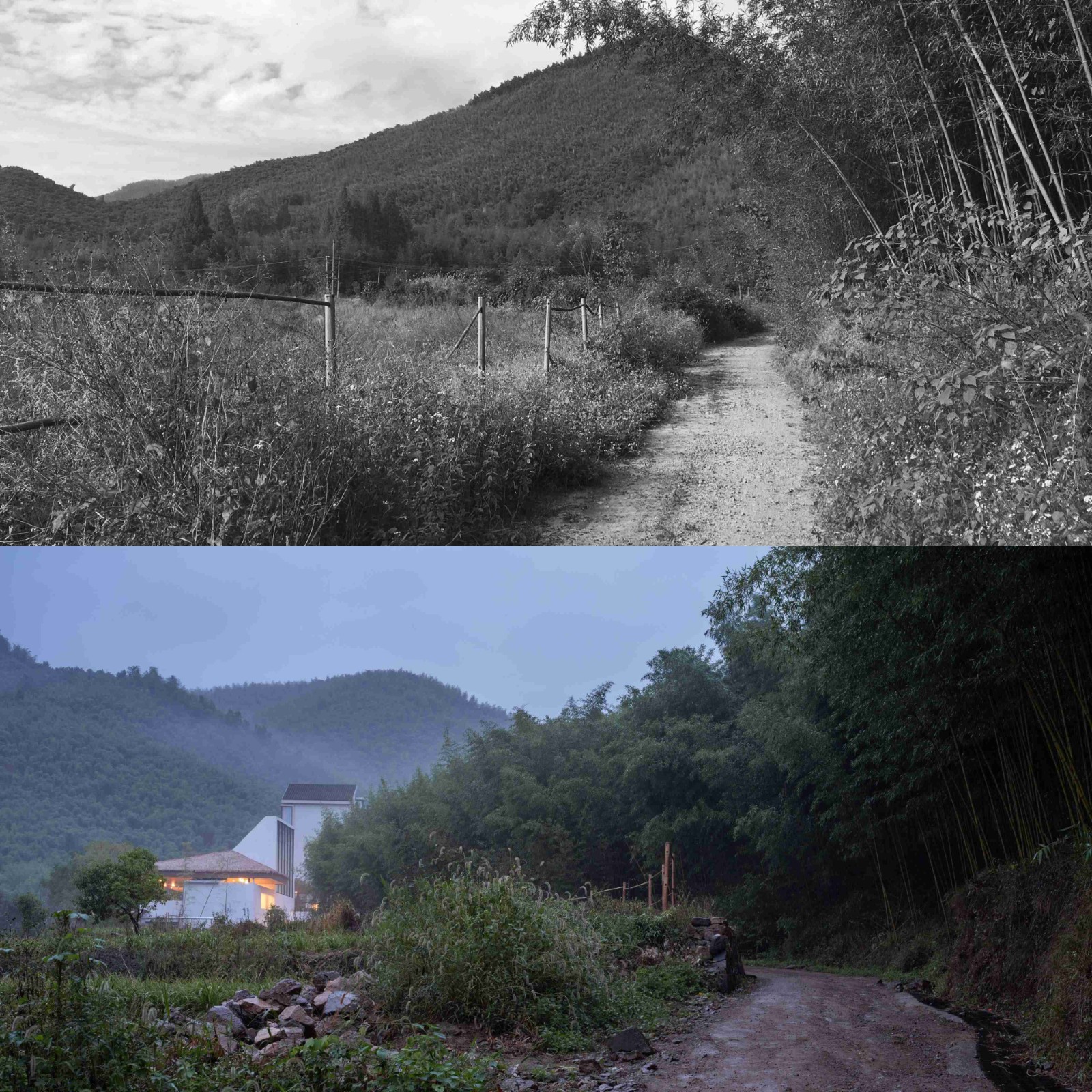 場(chǎng)地本身狹長(zhǎng),寬度10—15米不等,一路緩坡向上。場(chǎng)地東西兩側(cè)有著完全不同的自然特質(zhì),一側(cè)開闊壯美、一側(cè)靜密宜人,給人帶來完全不同的體驗(yàn)。場(chǎng)地東側(cè)緊貼山坡上的竹海,竹枝似乎可以直觸碰身體。而西側(cè)是相對(duì)開闊的農(nóng)田,腳下有山溪流過,遠(yuǎn)處是群山的層層剪影。我們看過場(chǎng)地后最初的直覺是這兩邊的“風(fēng)景”是場(chǎng)地最吸引人的特質(zhì),而我們也開始思索怎樣能把這些風(fēng)景帶入每間客房,怎樣挖掘并塑造竹海、溪流、農(nóng)田的景觀特質(zhì),創(chuàng)造不一樣的風(fēng)景。