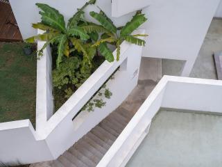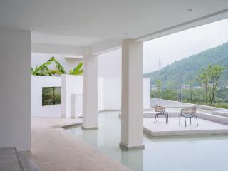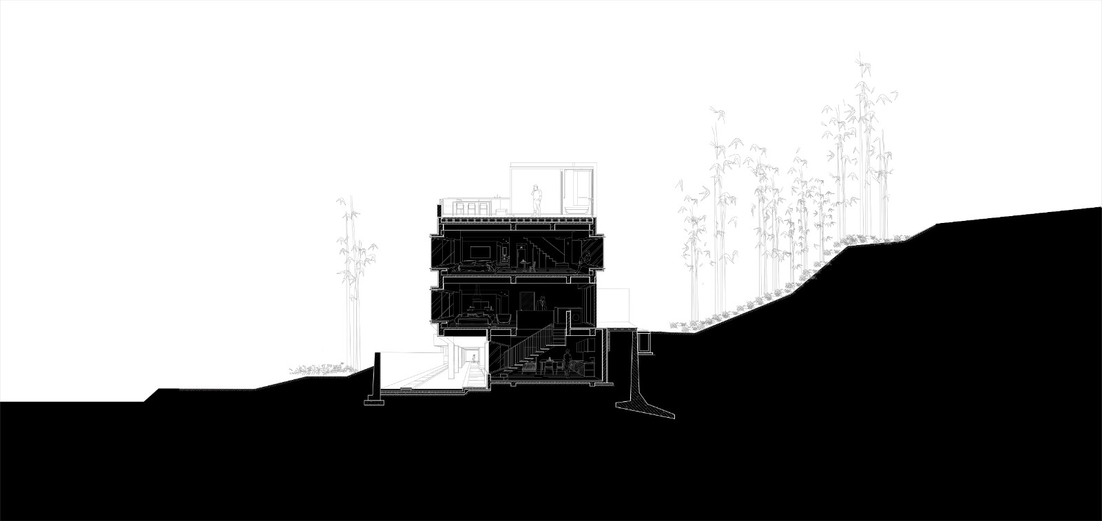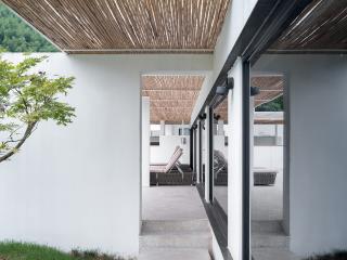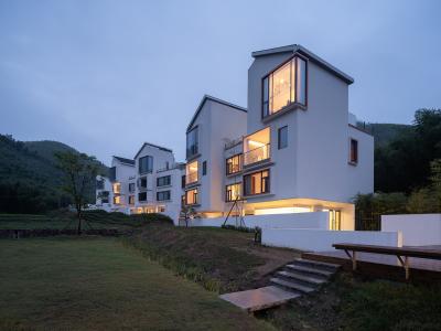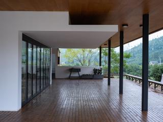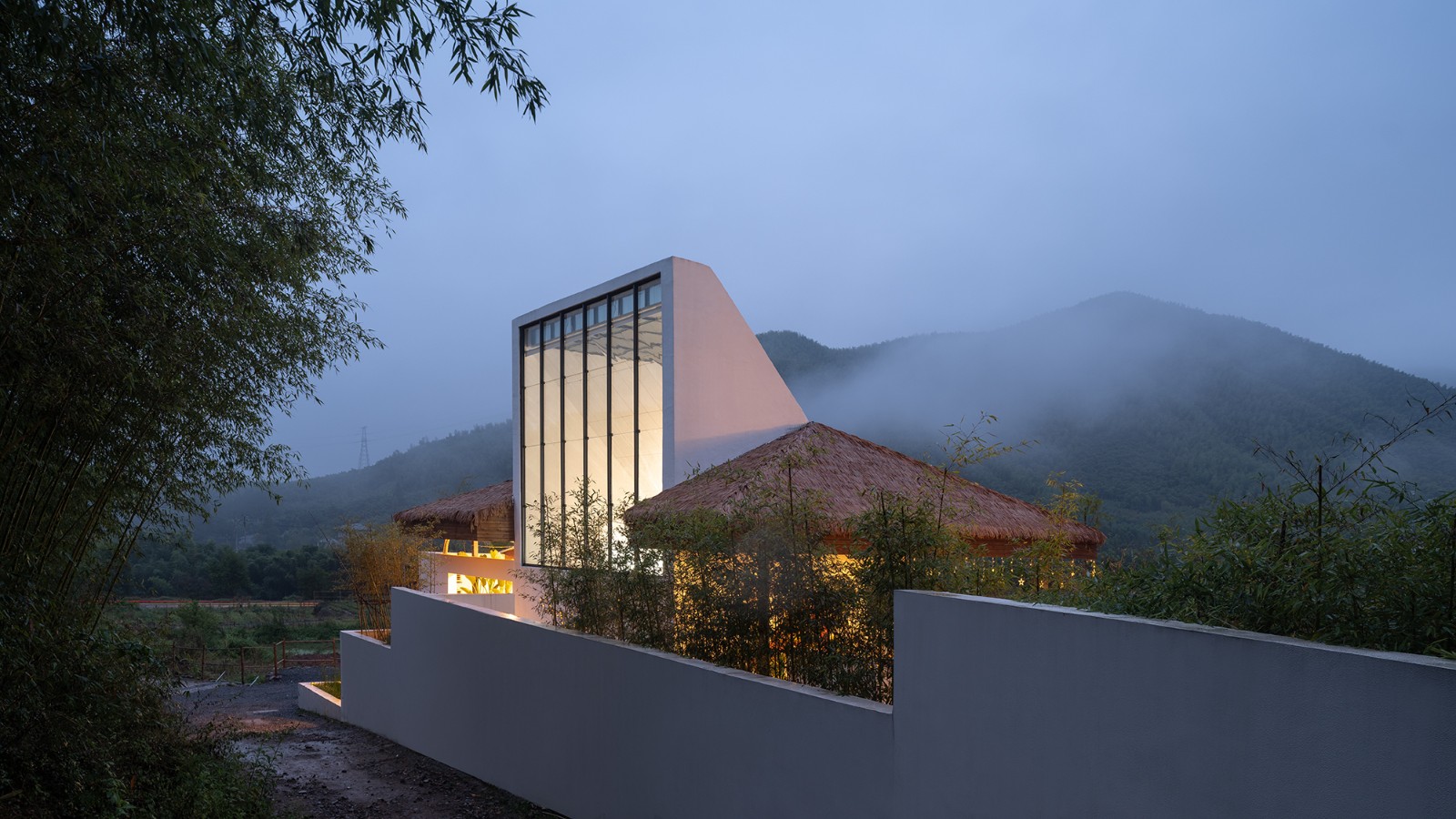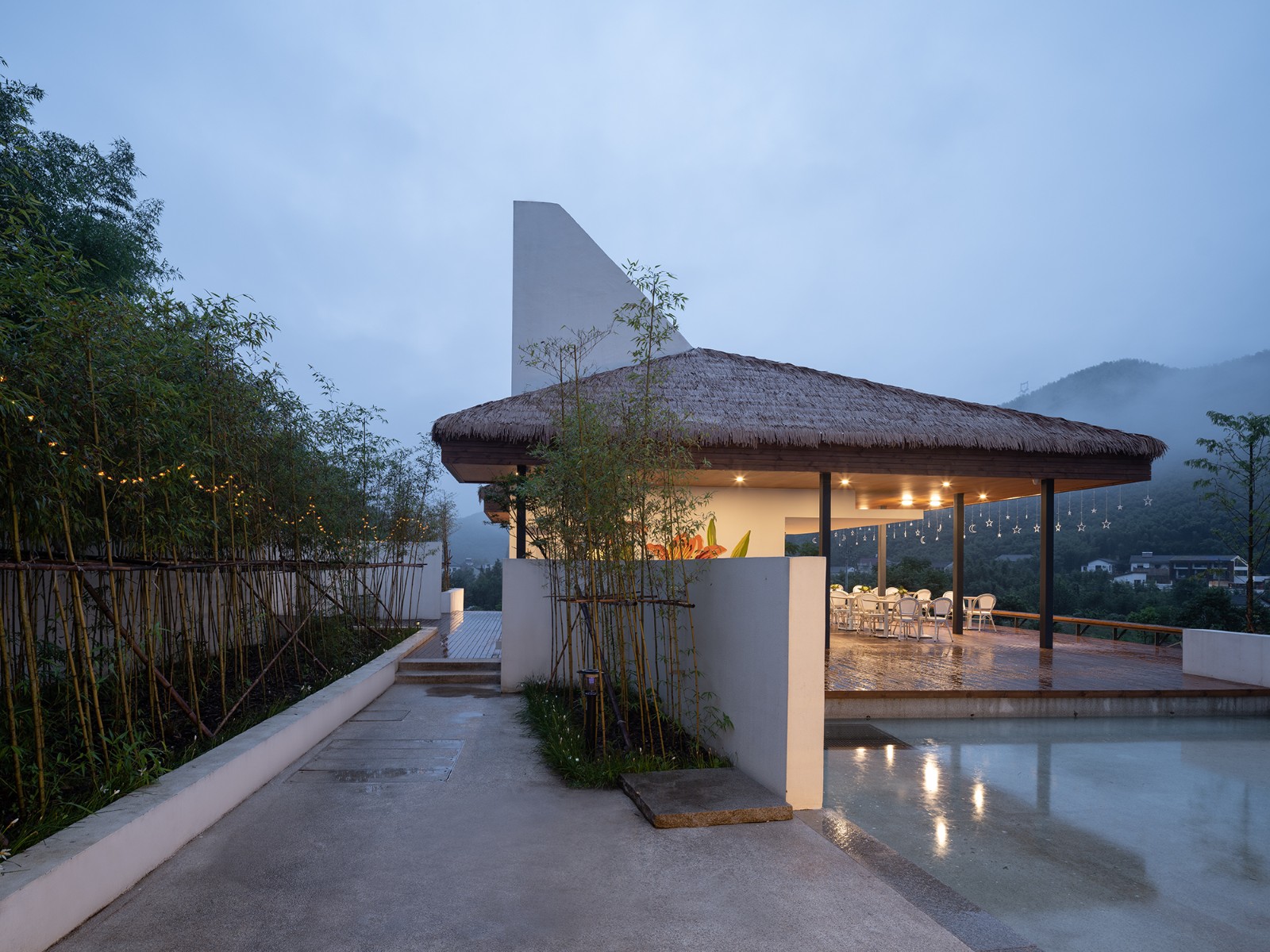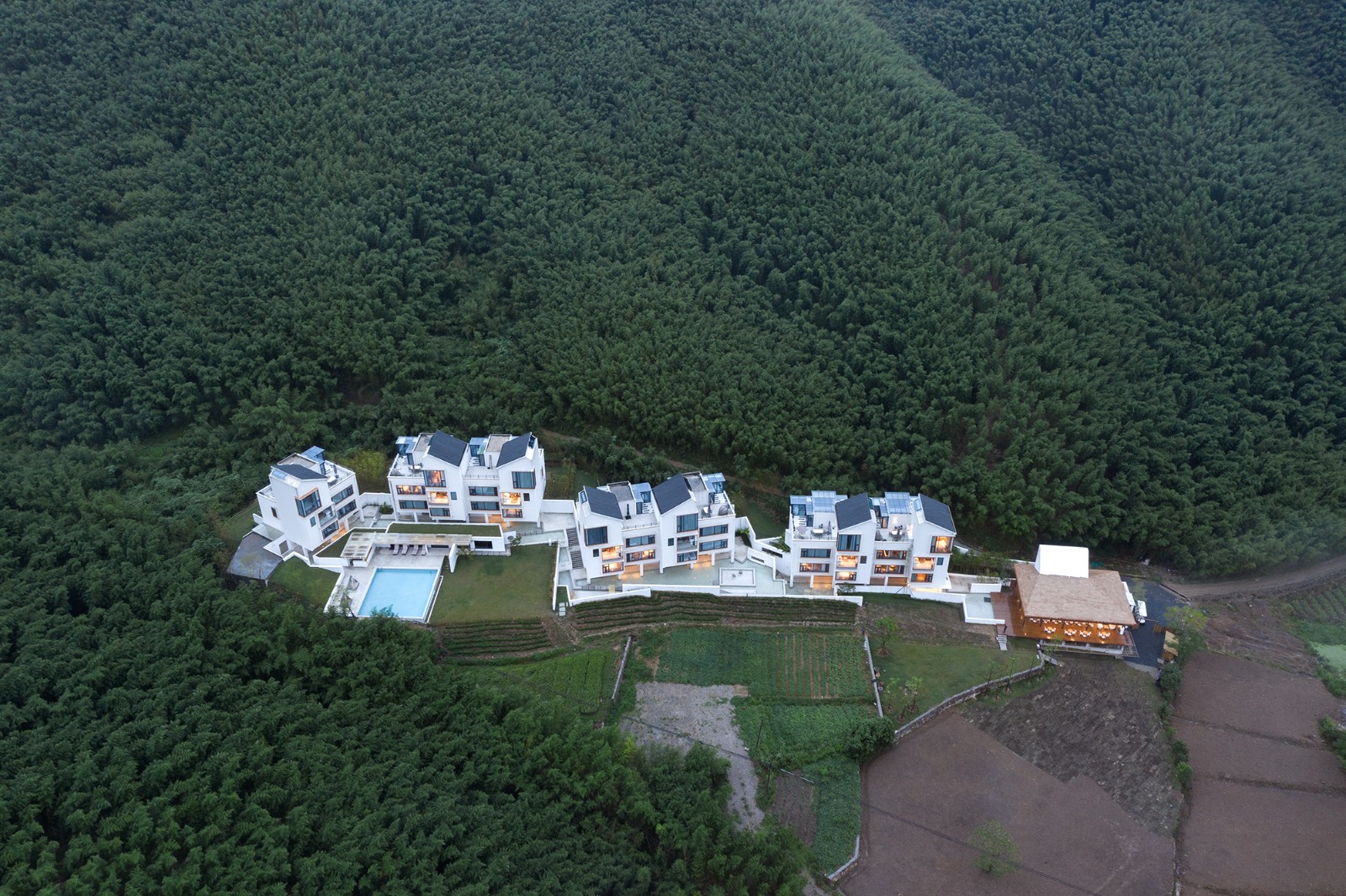 首層兩間客房附帶臨山一側(cè)的竹林小院,坐在院中可靜享山林野趣;頂層兩間客房附帶屋頂風(fēng)景露臺(tái),站在屋頂,背靠竹??蛇h(yuǎn)望群山;中間平層戶則設(shè)計(jì)了嵌入建筑中的觀景陽(yáng)臺(tái)。
