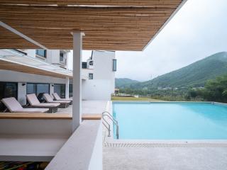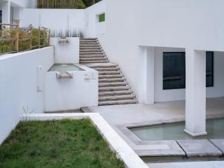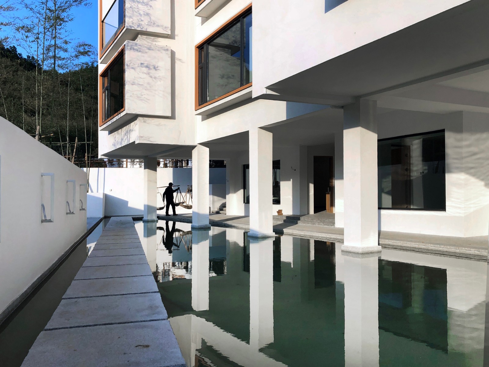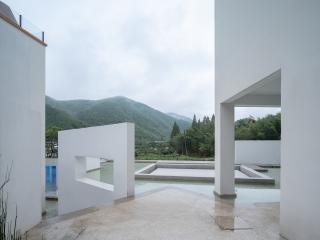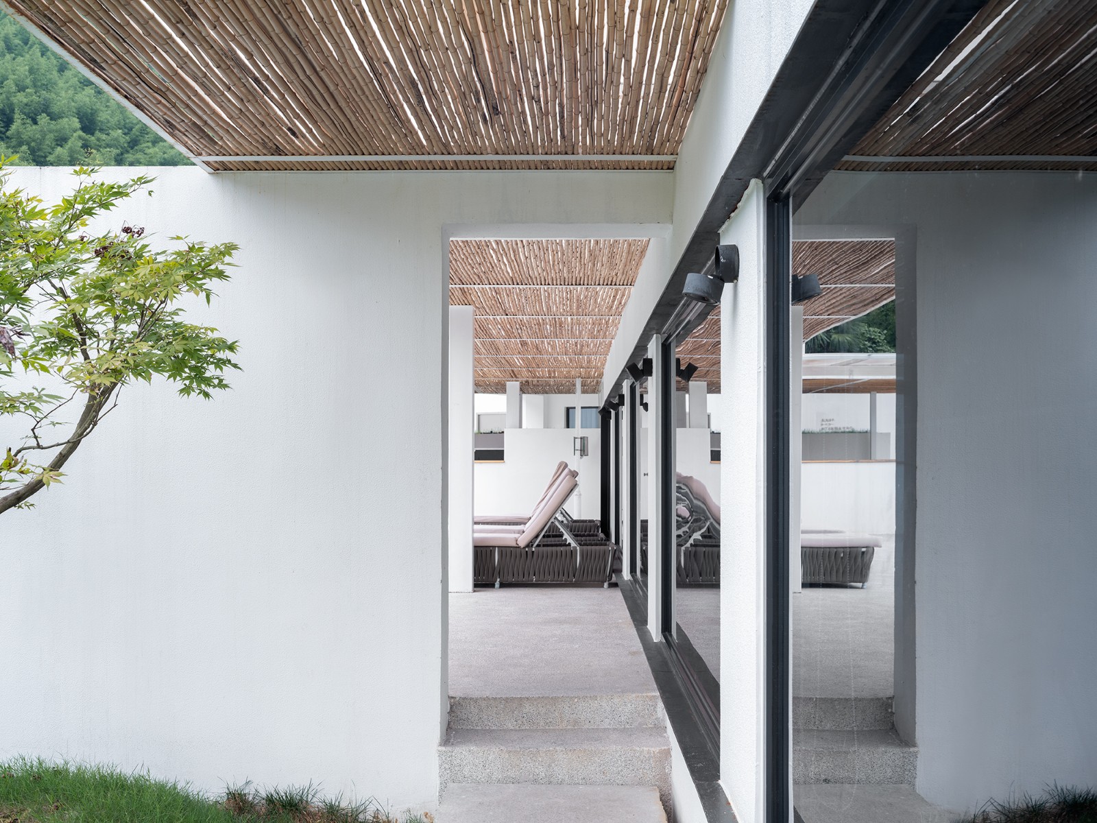 在場(chǎng)地最高處設(shè)置了恒溫泳池,泳池面向遠(yuǎn)山與田園,兩側(cè)的檐廊將風(fēng)景環(huán)入其中。