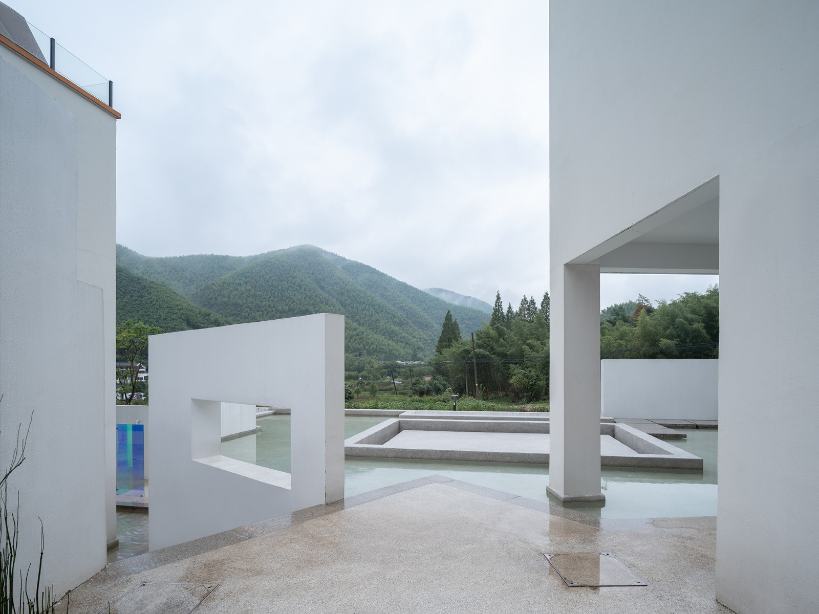 跌落的水流、濺起的水花和延綿的水波激發(fā)了人不同感官的體驗(yàn)潛能。溪水撐開庭院,將群山攬入院中,連廊與庭院一起模糊了建筑內(nèi)外的邊界。在廊中前行,庭院扭轉(zhuǎn)開合,群山、竹海、農(nóng)田,風(fēng)景隨之變換, 連廊提供了一種看風(fēng)景的角度,同時(shí)也創(chuàng)造了獨(dú)特的風(fēng)景。