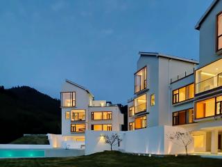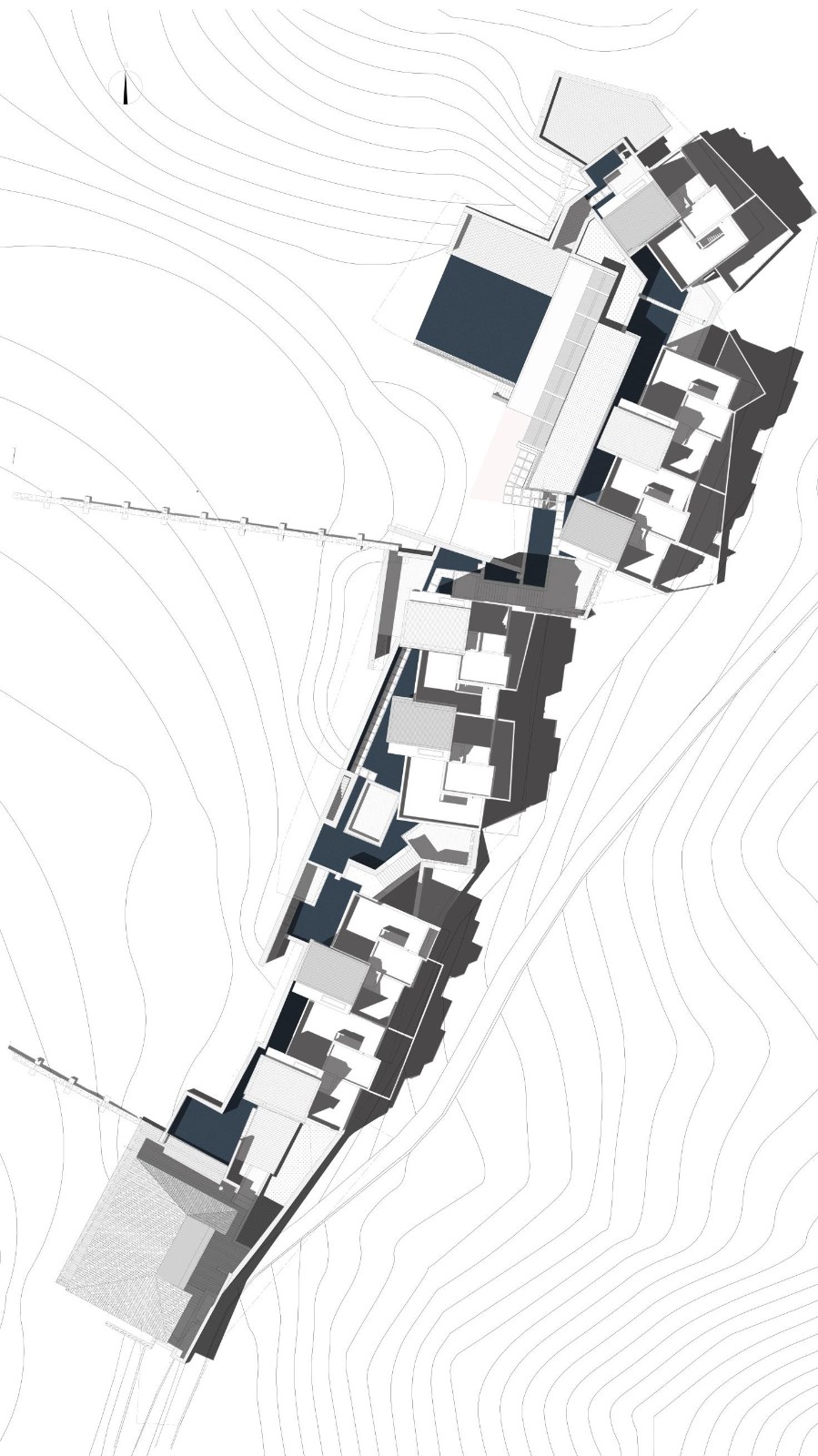 酒店共設(shè)計(jì)了35間客房,建筑布延續(xù)臨近山村的格局,若干棟建筑隨山就勢(shì),散落在狹長(zhǎng)的場(chǎng)地之中。為了讓每間客房都同時(shí)擁有山谷兩側(cè)的風(fēng)景,我們采用了一梯兩戶單元式布局,七個(gè)單元沿山谷高低依次展開,每棟有五間格局不同的客房。