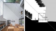 餐廳位于入口處,我們創(chuàng)造了一個(gè)高聳的內(nèi)部空間,45度的鏡面天花將高窗外的竹海反射到天花板上,鏡面帶來的錯(cuò)覺讓天花板呈現(xiàn)出無邊框大面積開窗,而窗外是從兩個(gè)方向伸展出的竹海,在這一過程中我們利用鏡面反射錯(cuò)覺為室內(nèi)塑造全新的風(fēng)景。