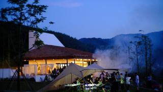 溪谷外側(cè)的60畝田園不僅是從酒店客房看出去的風(fēng)景,更是酒店重要的活動(dòng)空間。隨臺(tái)地而上,我們?cè)谌齻€(gè)不同的高度平整場(chǎng)地,形成三處可以進(jìn)行婚禮、燒烤野餐活動(dòng)的室外空間。