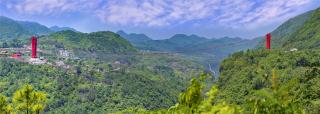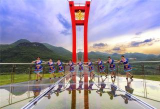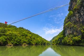 Known as the "picturesque corridor in Lingnan region", Huangchuan Three Gorges is the main tributary of the Beijiang River system in the Pearl River Basin and the end of Qianghan Ancient Path. Han Yu, a famous poet in Tang Dynasty, once wrote a poem to depict its magnificent scenery. The suspended glass bridge spans the cliffs, and overlooks the largest cluster of waterfalls in Northern Guangdong. Like a dragon that soars into the sky, it harmoniously coexists with nature.