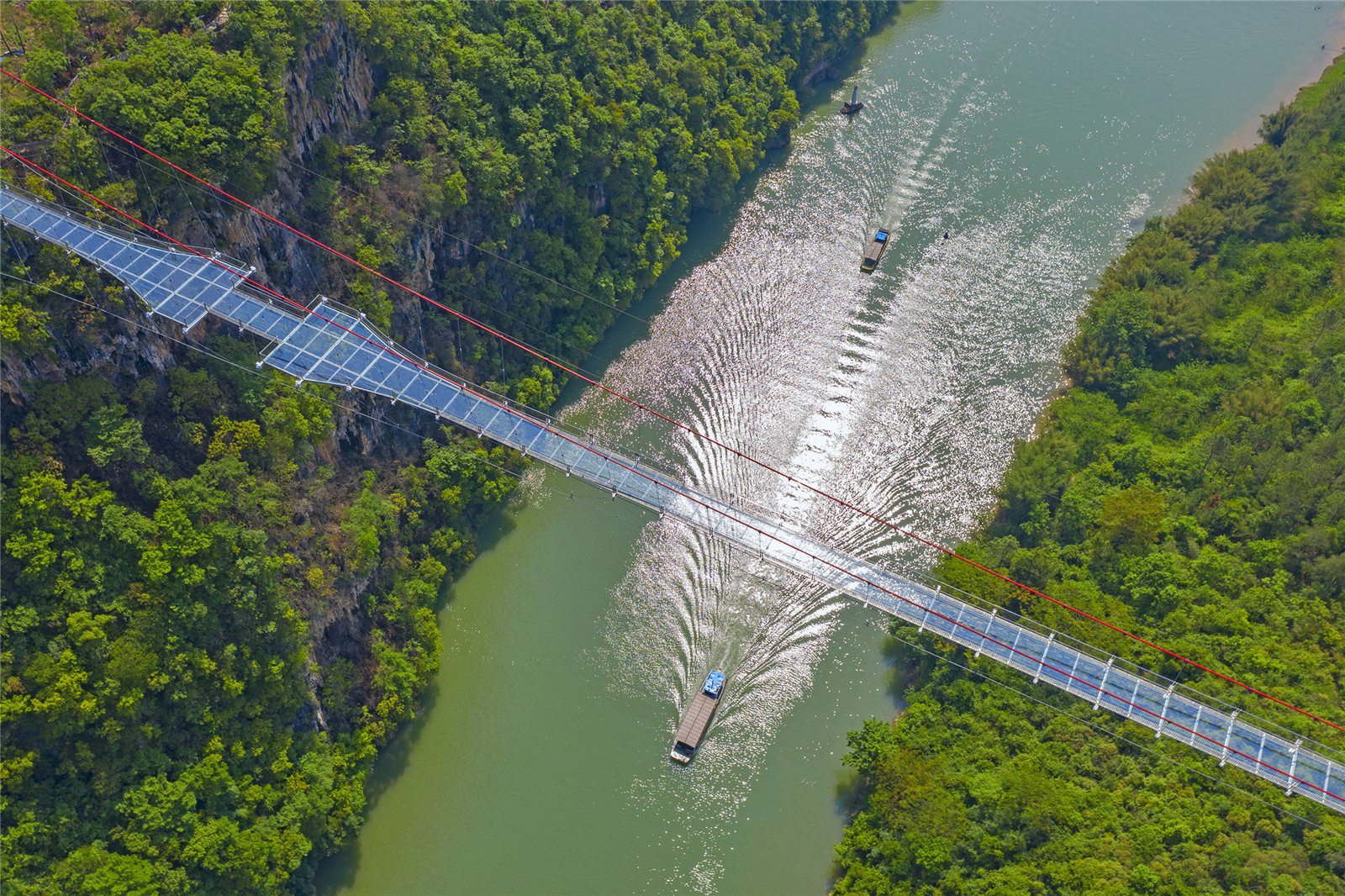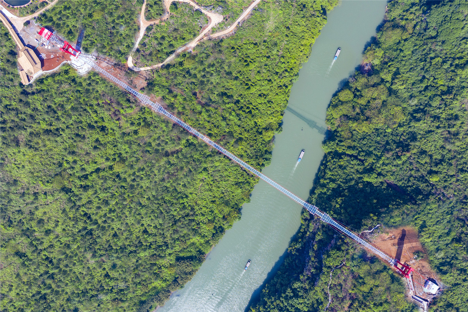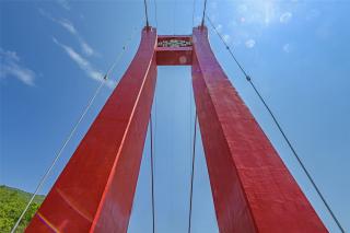 The bridge is paved with three layers of 4.5-centimerter-thick ultra-clear tempered laminated glass, the visible transmittance of which is 99.15%. The glazing endows the bridge deck with crystal-like luster, high transparency and refractive index. The glass, the guardrails composed of curved stainless steel bars, the bridge tower and red main cables, together form a built landscape that combines the solid and void, the modern and the classical.
