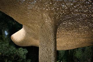 Further along at the edge of the island, the canopy shrouds itself within the large masts of bamboo. At first glance it appears to rely on little for support, only the columns of bamboo shooting up and through circular openings. Hidden amongst these living clusters columns twist from their footing upward and outward mimicking the indecisive route of the bamboo to meet the structure above. Supported by the columns in a maze of tubes, the structure of the canopy while seen doesn’t look out of place. The hand-woven layer obscures what is in front and what lays behind.