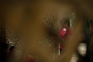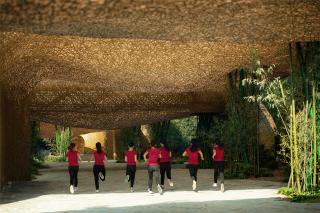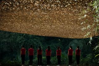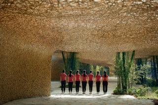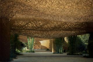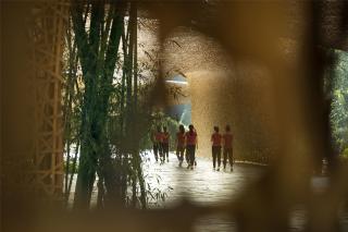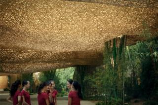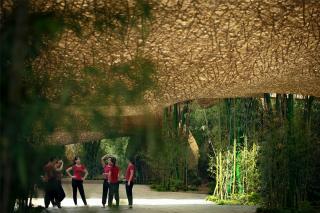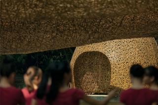 Stretching 140m from where you stand the woven ceiling takes on a shape of an inverted landscape, undulating between different levels of surfaces. The stepping surface of the canopy is pieced together entirely in the same irregular hand-woven bamboo as the lantern, but on a scale that seems that it should be seated in fantasy. The resulting intention means to enchant while still extending recognition to the natural condition of the site.