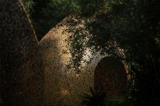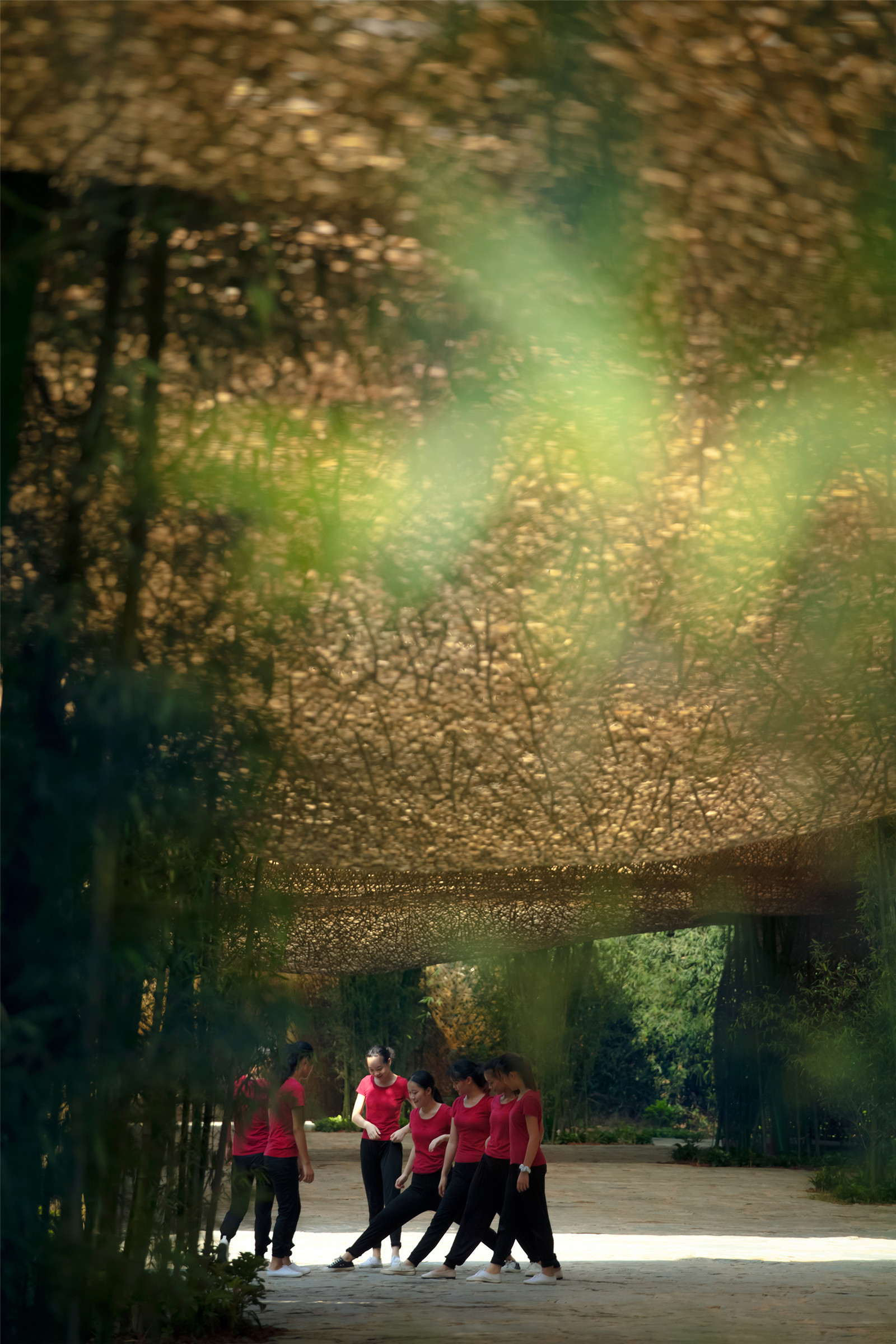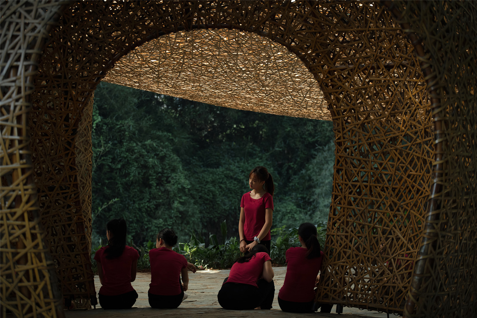 對劉三姐印象的戲劇精神的認(rèn)可及對當(dāng)?shù)刈匀画h(huán)境的感動和尊敬,很多感知的元素潛移默化地穿插進(jìn)入了設(shè)計(jì)的許多部分:手工編織文化的融入,竹條材料的使用與自然竹林環(huán)境的融合,竹棚起伏的倒置地形在竹叢立柱之間的舞動,結(jié)構(gòu)柱的體態(tài)與竹子生長形態(tài)的呼應(yīng),甚至在敘事性的流線及互動情境中,訪客從一個竹燈移到另一個空間的方式,這些微妙的細(xì)節(jié)提示共同激發(fā)了特定的意識感知框架,為訪客觀看印象劉三姐的演出帶來了最好的心理和文化的鋪墊。