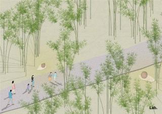 目前,大部分地區(qū)都覆蓋有大片竹子,形成了竹林綠道長廊的結(jié)構(gòu)。為了與已經(jīng)存在的方式相吻合,新建筑考慮借用竹子的生長習(xí)性和其生長過程中形成的空間形態(tài),將其重新配置以形成新的空間。這樣的設(shè)計(jì)和實(shí)施策略,使新形成的空間不會與現(xiàn)有的自然環(huán)境相互競爭,同時卻有呼應(yīng)和強(qiáng)化的效果。盡管自然的手法,達(dá)到最佳效果需要過度時期和相對來說較長的時間,但這樣的過程反而更能體現(xiàn)出這樣可生長的設(shè)計(jì)策略的力量,同時增強(qiáng)了感受者與周圍的竹林和丘陵的互動感和意識感。