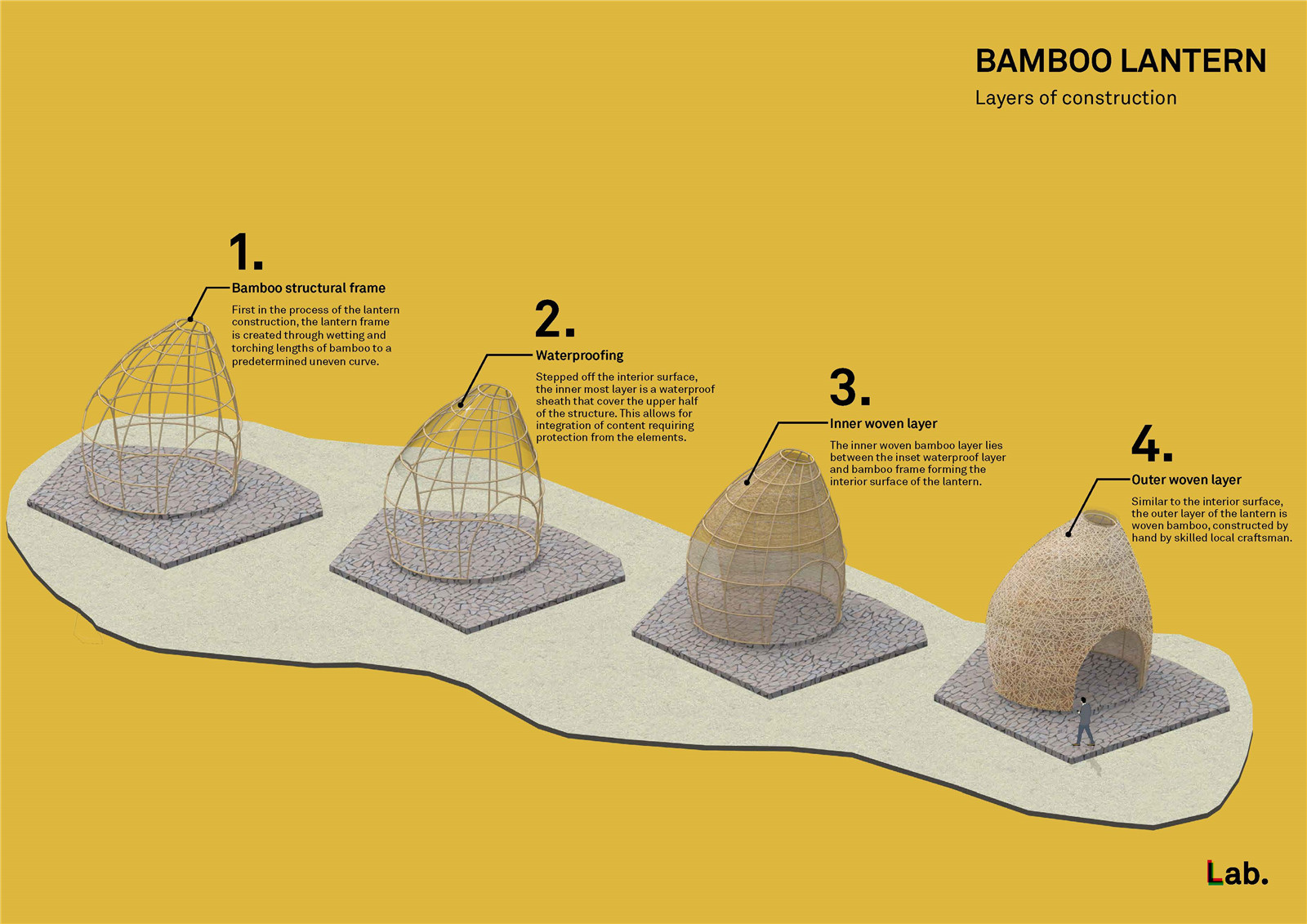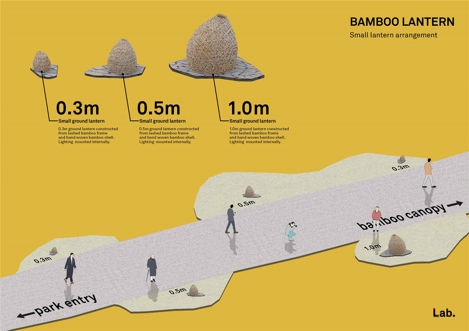 When entering the site, lanterns small in stature line along the pathway cast out signals of dappled light. As visitors travel further the once small lanterns become drastically larger to a point where the guests can find themselves able to walk inside. The makeup of the lanterns remains sincere, with a structure of bamboo lengths encased in lashed bamboo either side.