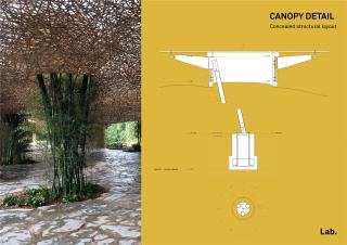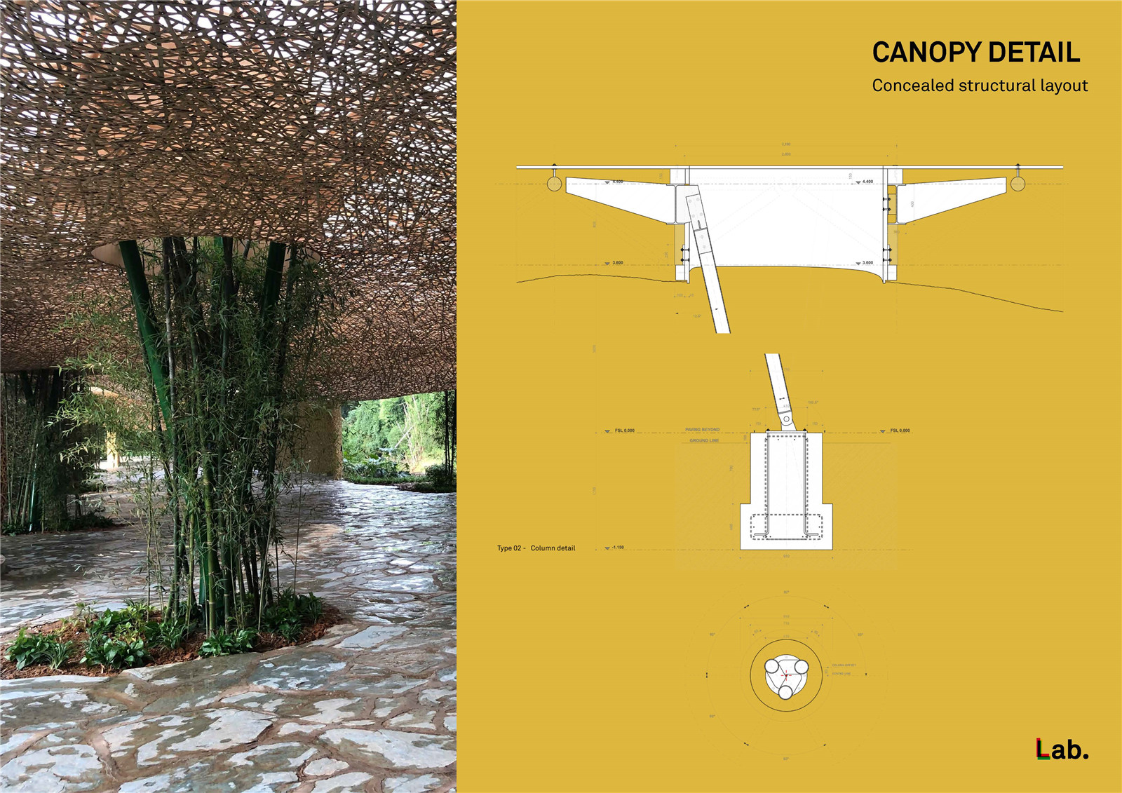 The first, woven bamboo lantern structures, scattered where guests circulate, whose purpose is to guide and intrigue. Then the other, a stretch of woven canopy amongst clusters of bamboo, providing area to walk sheltered from regular rainfall. In these, the architecture relies on bamboo not only for its composition, but also its constant referral to parts that constitutes the place.