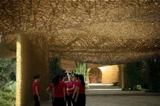 光線穿透竹編波浪,將斑駁的光點(diǎn)散布到地面上。當(dāng)在竹棚下行走時,光亮通過竹棚散射開均勻的照亮整個空間,但當(dāng)抬頭仰望時,卻可感受到意想不到的視覺體驗(yàn)。整個頂篷散發(fā)出溫和的光芒,并發(fā)散出金色的光輝。當(dāng)夜色降臨時,竹棚體內(nèi)的人造燈光光線通過竹網(wǎng)的縫隙,將光體更有戲劇性更專注的照射在地面,頂?shù)變蓪庸獠ǖ膶?shí)虛包夾,更讓體驗(yàn)變得充實(shí)。