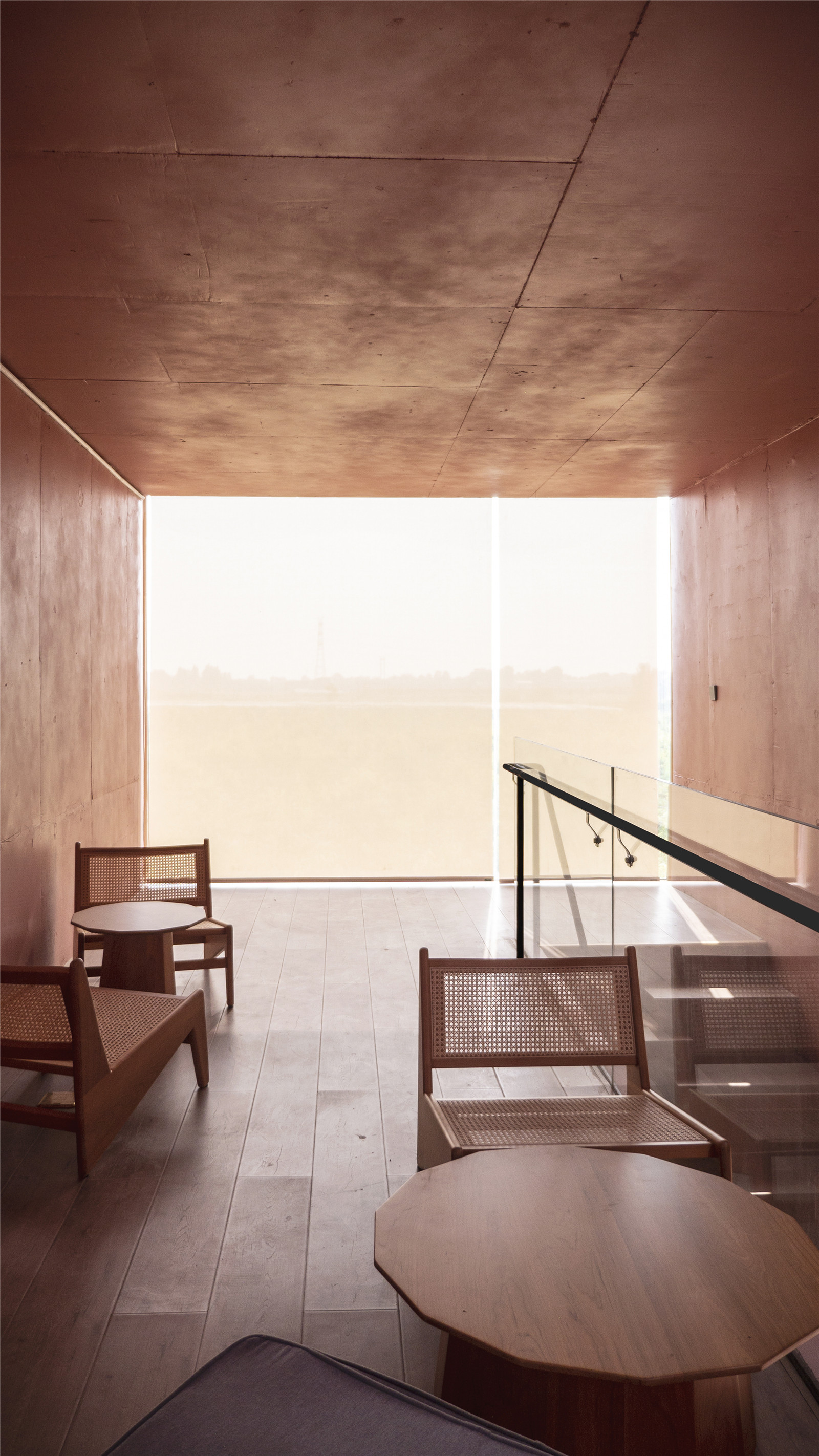 In the Peach Hut, all windows are of diverse shapes, responding to different views and light angles: the large floor-to-ceiling window on the second floor allows viewers to jump over the peach trees and overlook the panoramic view of the farm; the round window frame on the south side rotates along the central axis, and captures dynamic imageries of the orchard under the subtle variation of daylight; the vertical windows at the corners lengthen the depth of field from the orchard to the village at far; the shadow resulted from the skylight changes at every moment; and the entrance corner window is made as a quarter circle resembling the stooped peach trees, thus resonating with the picturesque land.