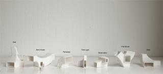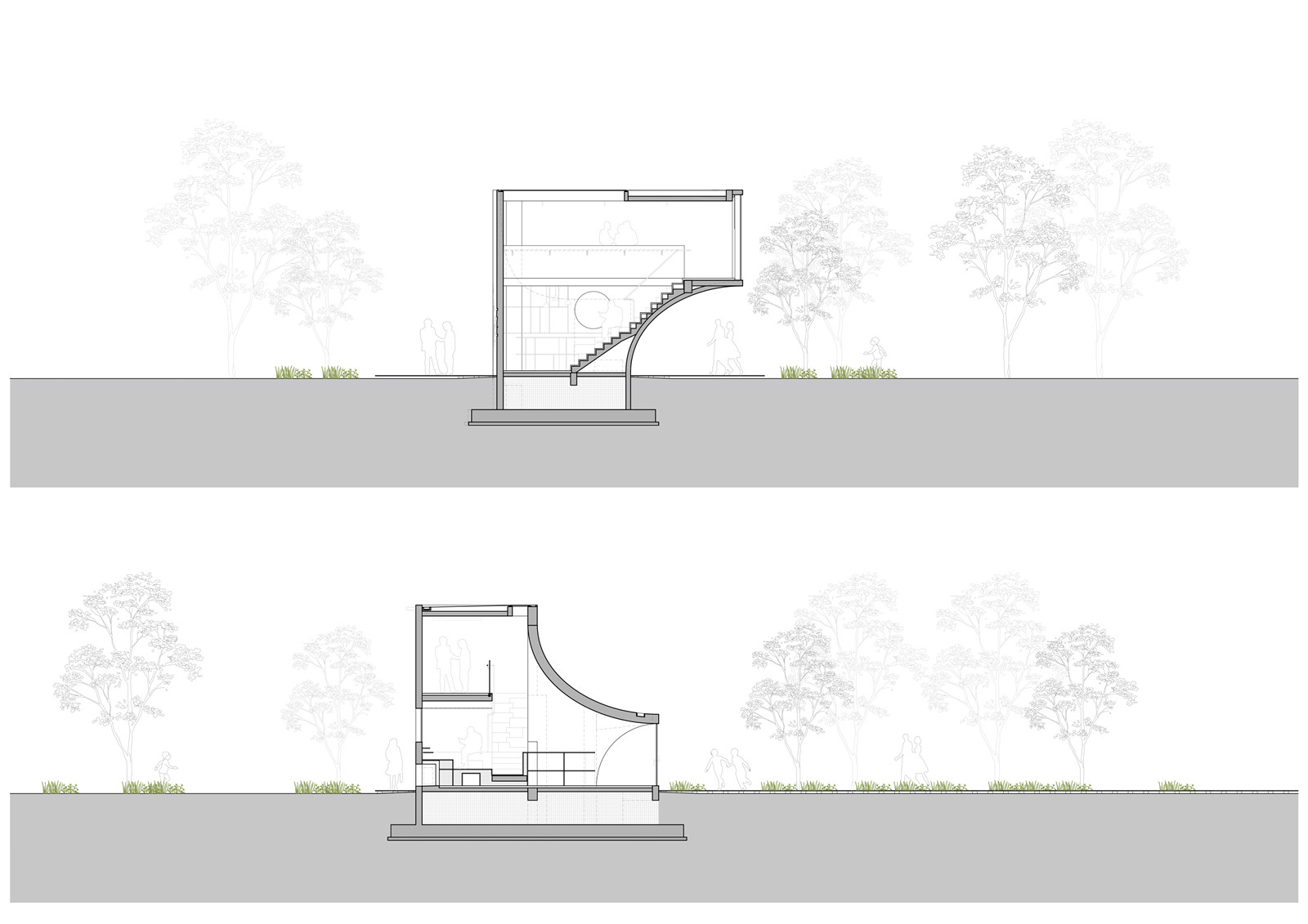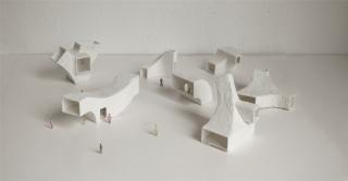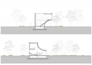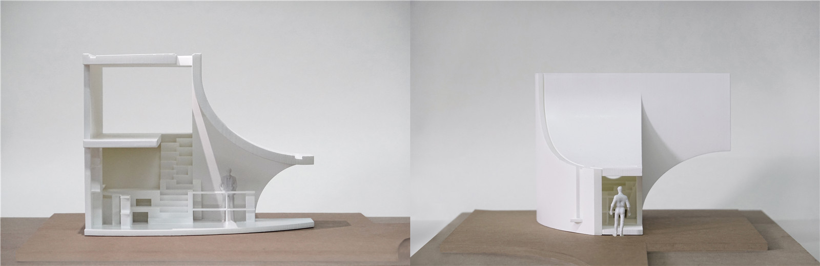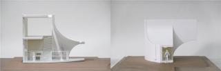 These cast-in-place concrete miniatures are interpreted into a series of tree-shaped spaces with tentacles reaching out for the sky, bathing in light and shadow. Their locations vary from fields, woods, to mountaintops, and their forms differ as well: while one grows out from the ruined walls in an abandoned village, another embodies a floating theater on the water.