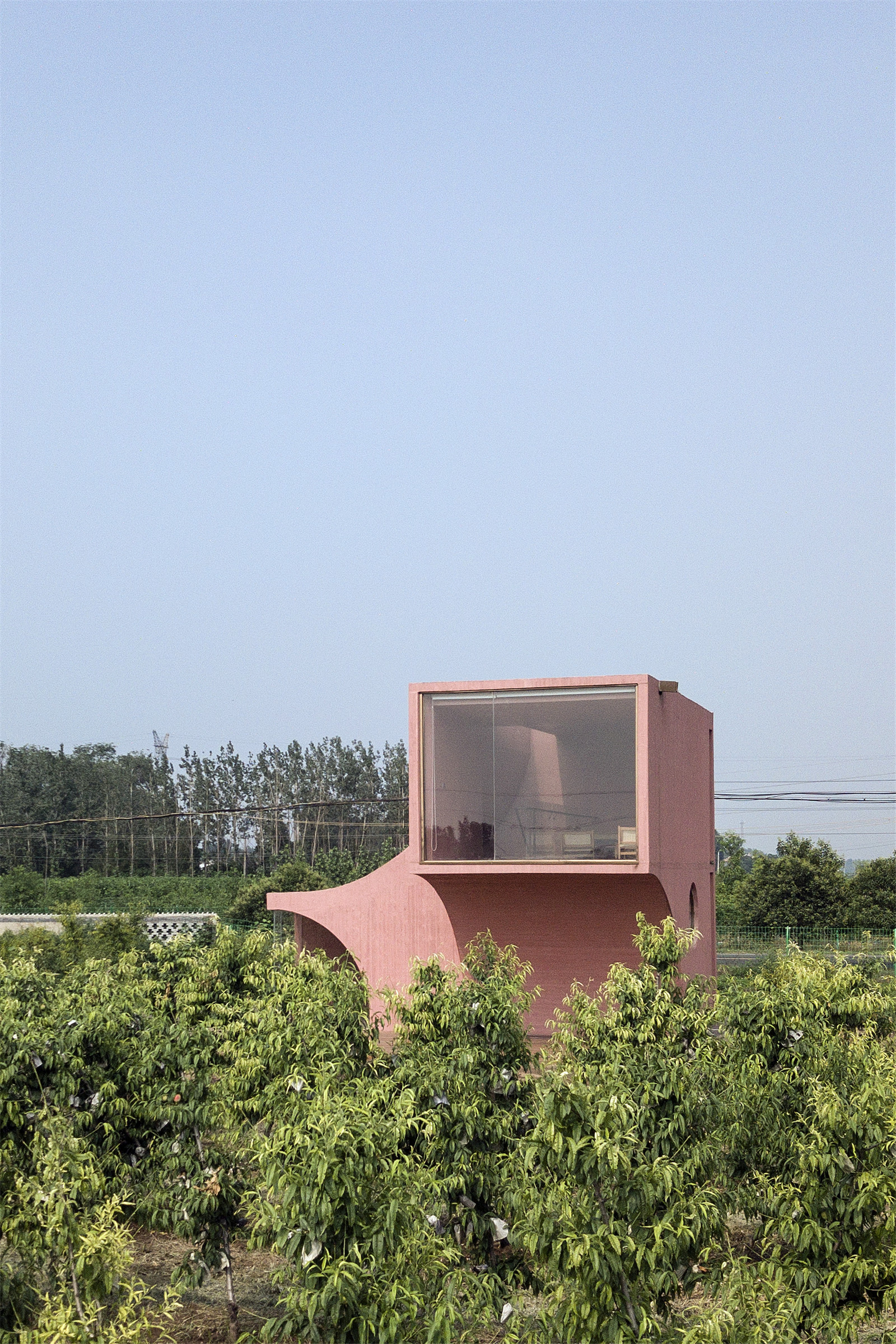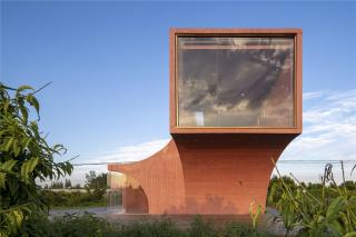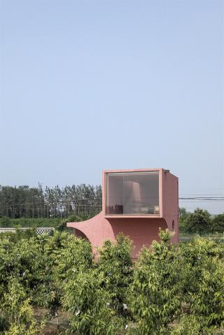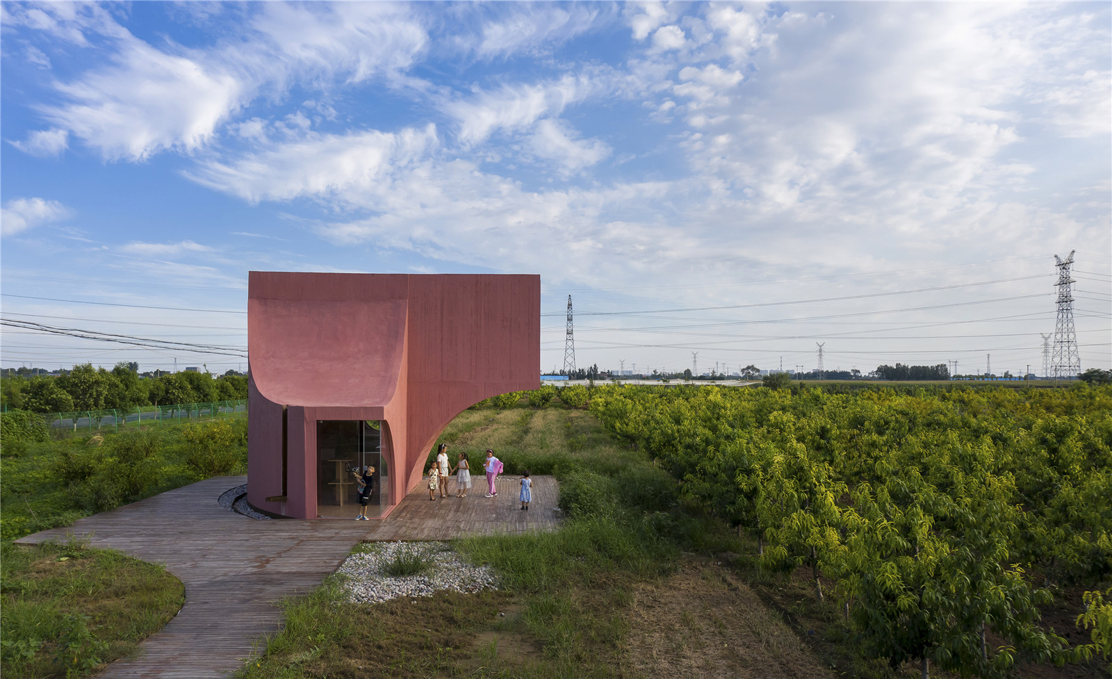 "Peach Hut", the first completed miniature pavilion, is surrounded by a field of blossoming peach trees in a farmland. The trees on the site which all lean to one side, which inspired the sculptural form of the architecture. The architect envisions that the building is cut from a series of invisible arcs derived from the earth and the cloud, forming a unique shape that rises to the sky.