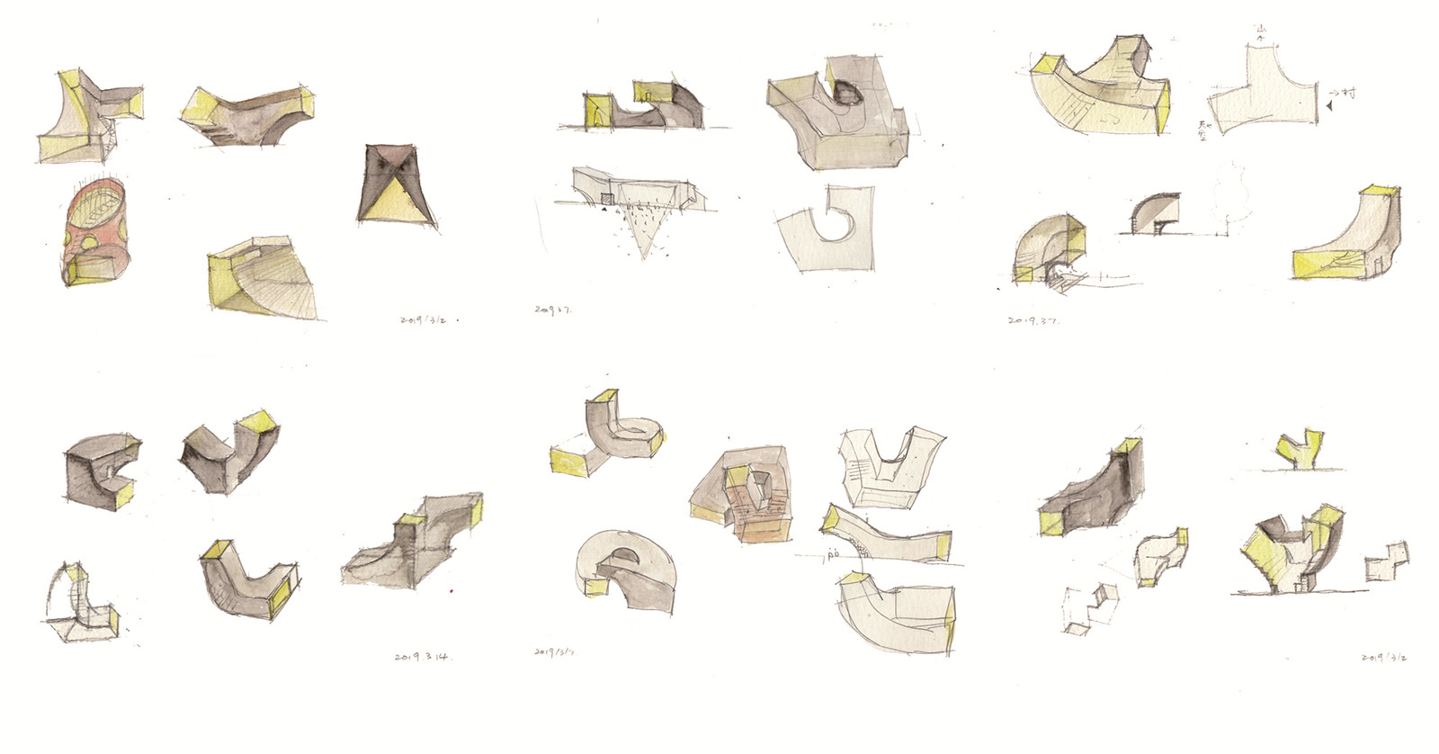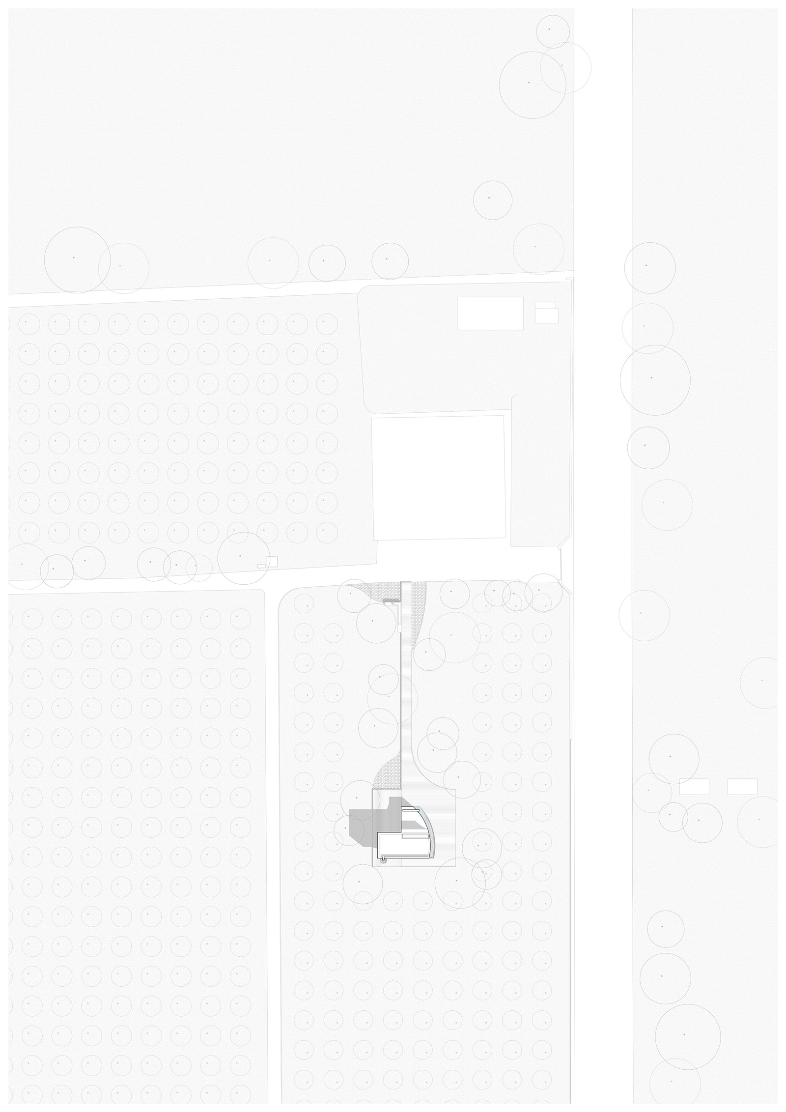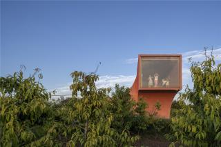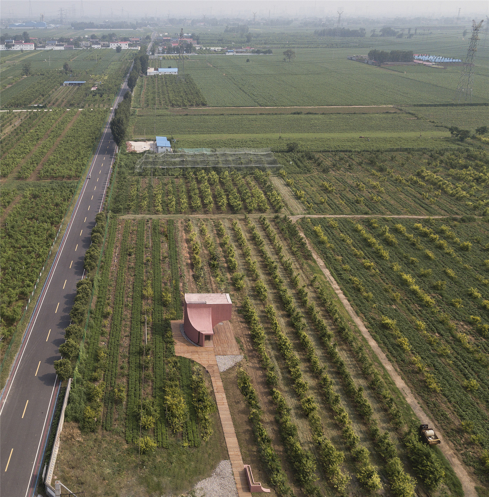 "Peach Hut", the first completed miniature pavilion, is surrounded by a field of blossoming peach trees in a farmland. The trees on the site which all lean to one side, which inspired the sculptural form of the architecture. The architect envisions that the building is cut from a series of invisible arcs derived from the earth and the cloud, forming a unique shape that rises to the sky.