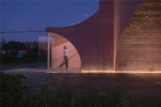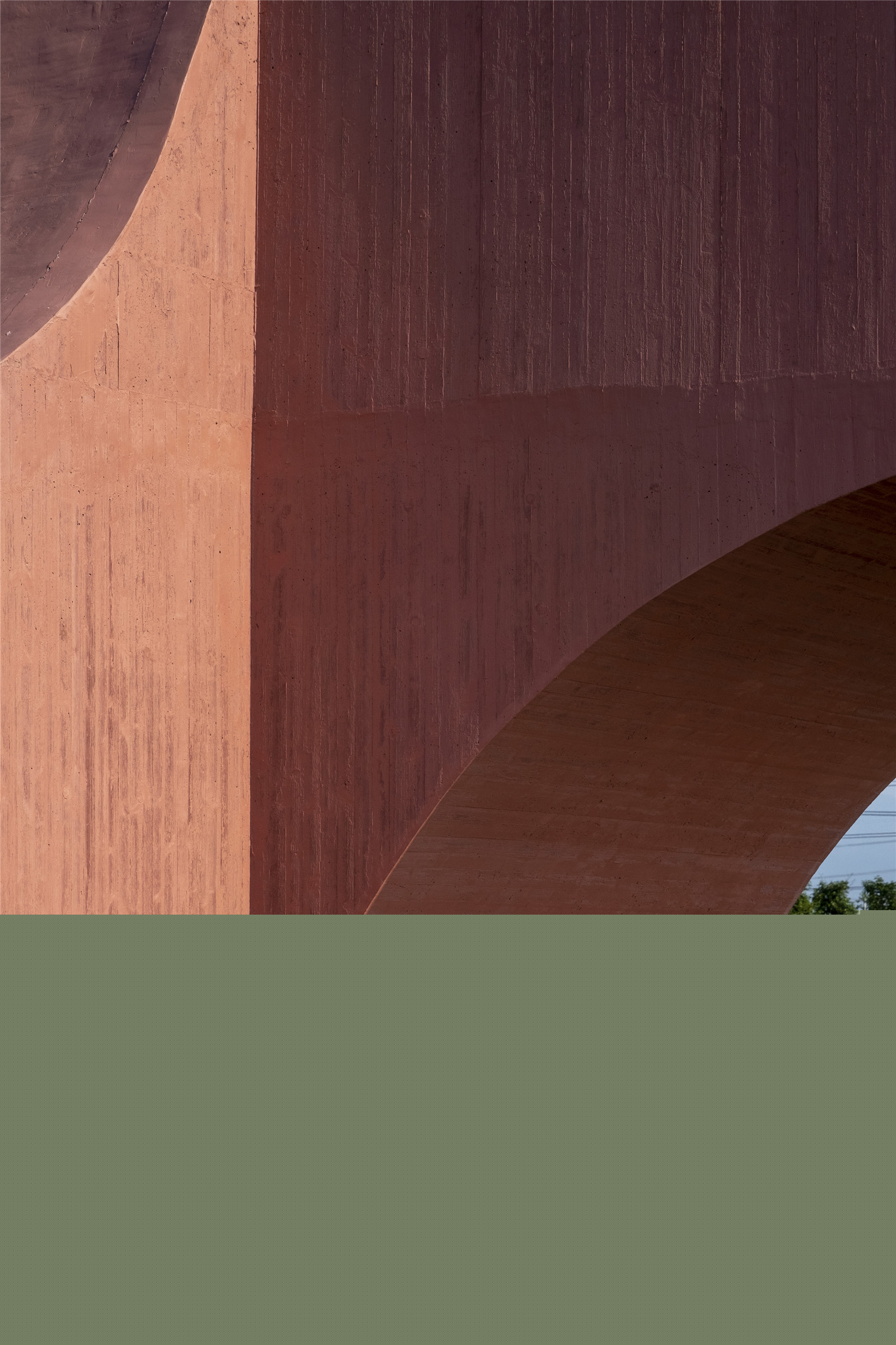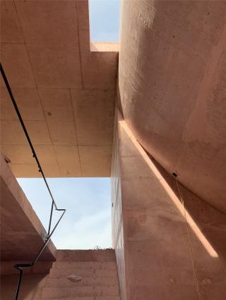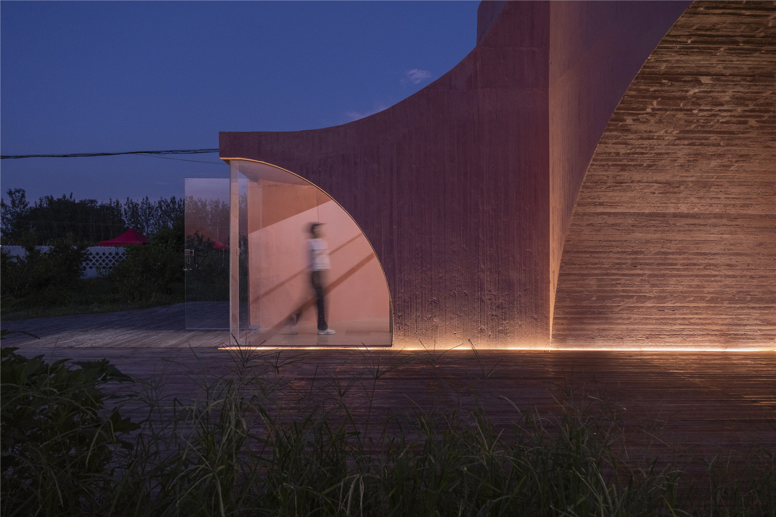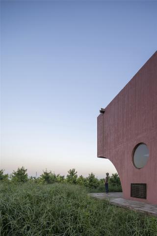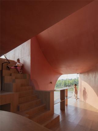 Impressed by the peach blossoms on the site during the first visit, the architect decided to coat the building with pink cast-in-place concrete. After repeated field tests, the architect and the construction team eventually found a formula that met the desired color and concrete strength. The exterior concrete finish is cast with small wooden formwork to outline the contour of the curved geometry, and the interior finish is cast with a smooth formwork to better reflect the skylight from above. In early morning, at noon, dusk and night, the pink concrete wall reveals different colors and qualities based on the changing light conditions.