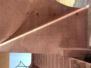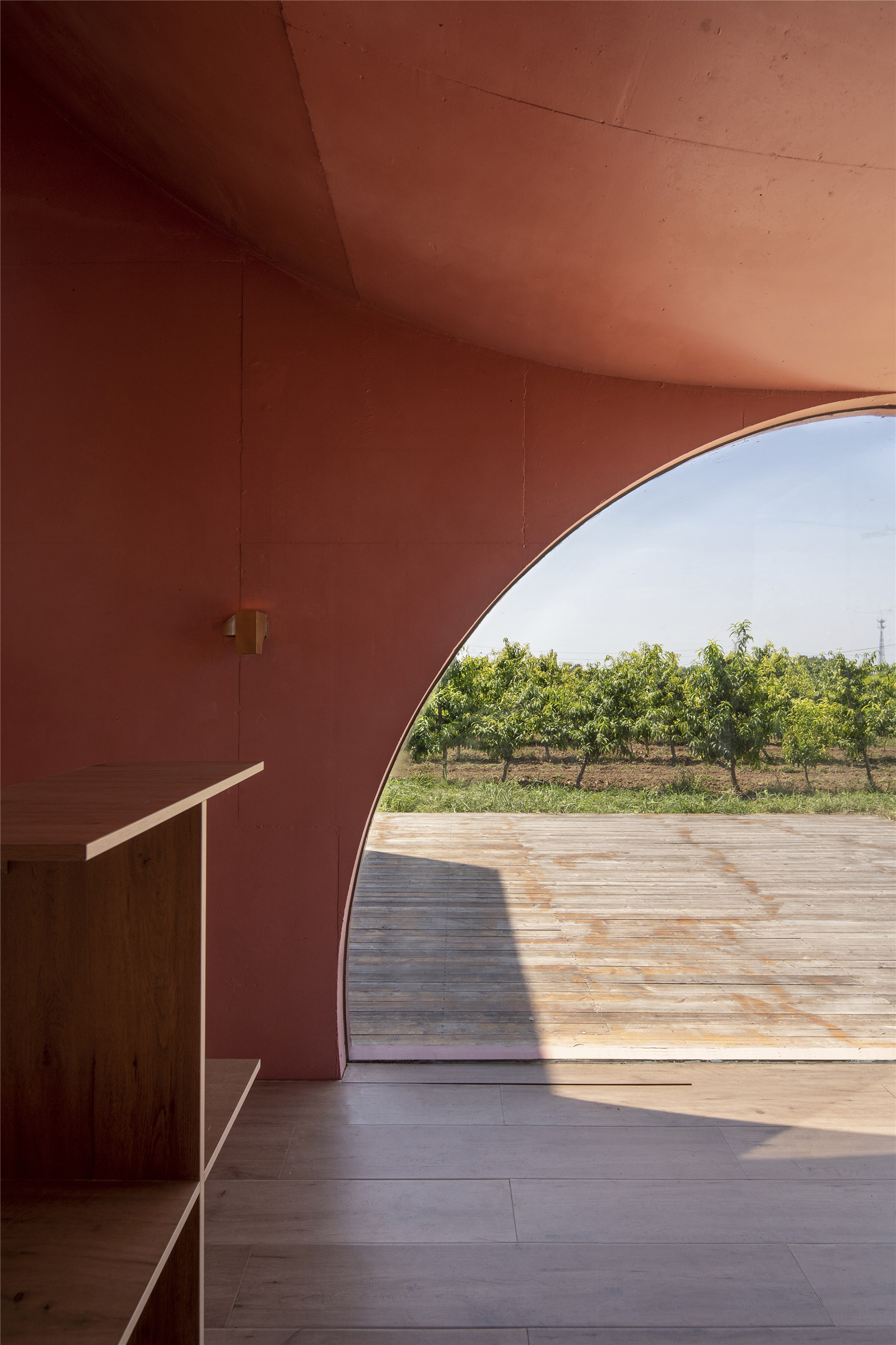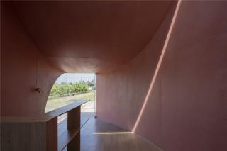 因?yàn)殡y忘第一次在場地上見到滿園的桃花盛開,建筑師決定用粉色現(xiàn)澆混凝土建起這座建筑。經(jīng)過一次次現(xiàn)場試驗(yàn)后,建筑師與施工隊(duì)終于調(diào)配出符合期望顏色和混凝土強(qiáng)度的配方。建筑外墻用碳化小木模板支模澆筑勾勒出弧形輪廓的圓滑線條,建筑內(nèi)部則用鏡面模板澆筑起光滑的室內(nèi)墻面、迎接天光的灑落。在清晨、正午、黃昏或夜色中,粉色混凝土墻面會(huì)因?yàn)椴煌饩€而呈現(xiàn)出不同的顏色狀態(tài)。