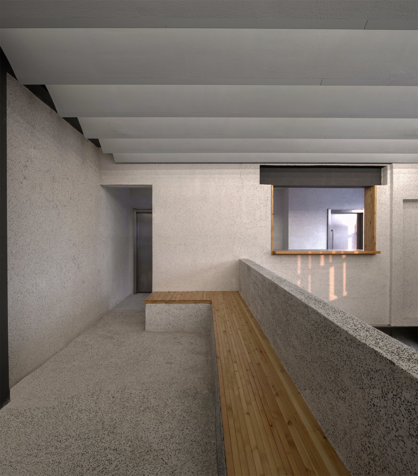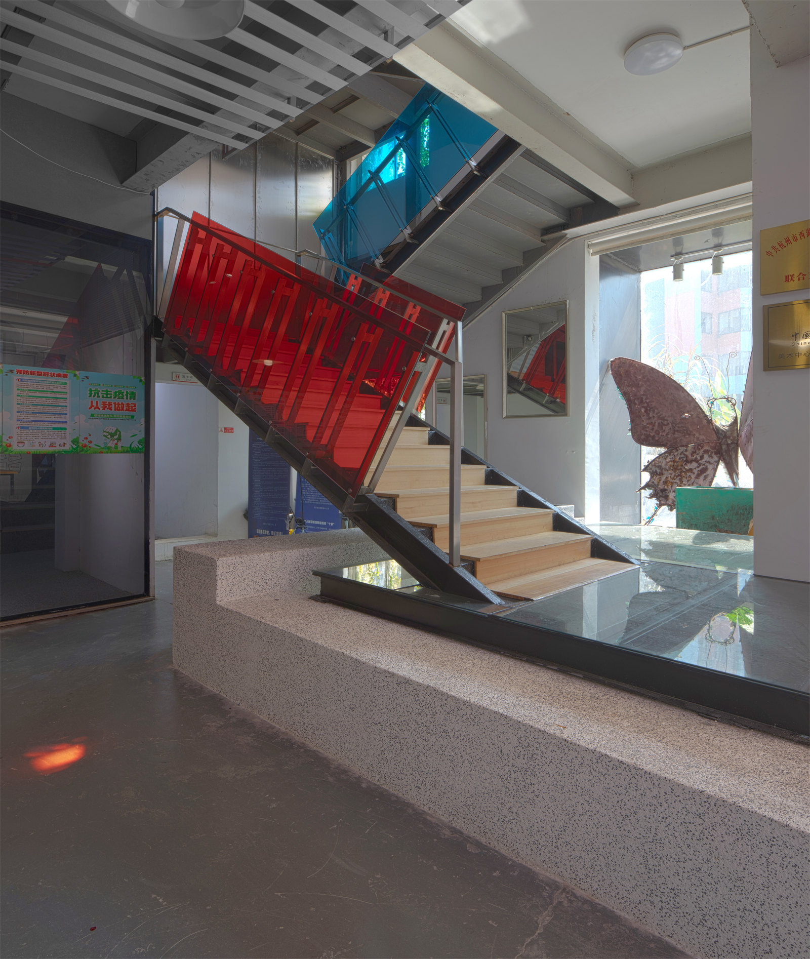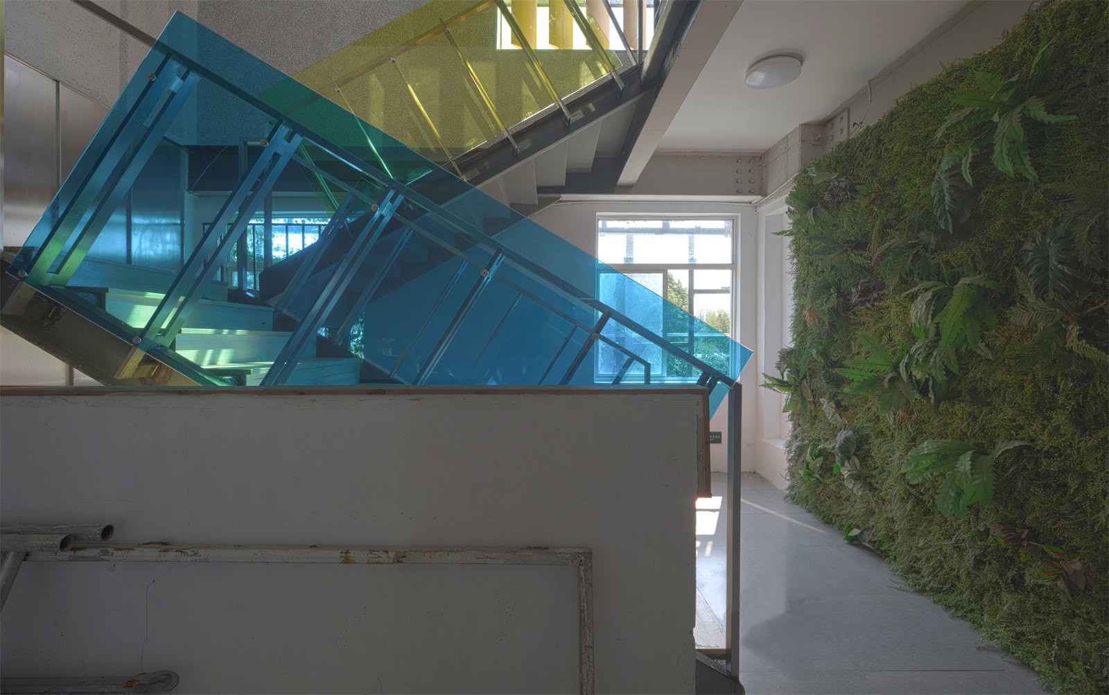 當風景被分解與分析,細微的感受就產生了。日光進入建筑后,發(fā)生了折射與反射,與物相融合,彼此消解。造訪者從室外小劇場進入大樓,通過原有鋼樓梯步行到3樓,最后徑直走向“追光舞臺”,側界面不同顏色的半透界面隱喻了光之分解,界面在不同時段有觸感和色溫的微弱差別,呈現(xiàn)出隱逸的美感。