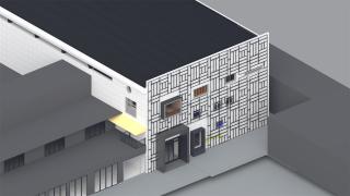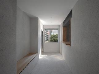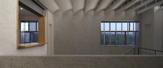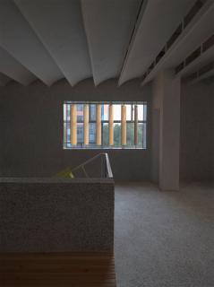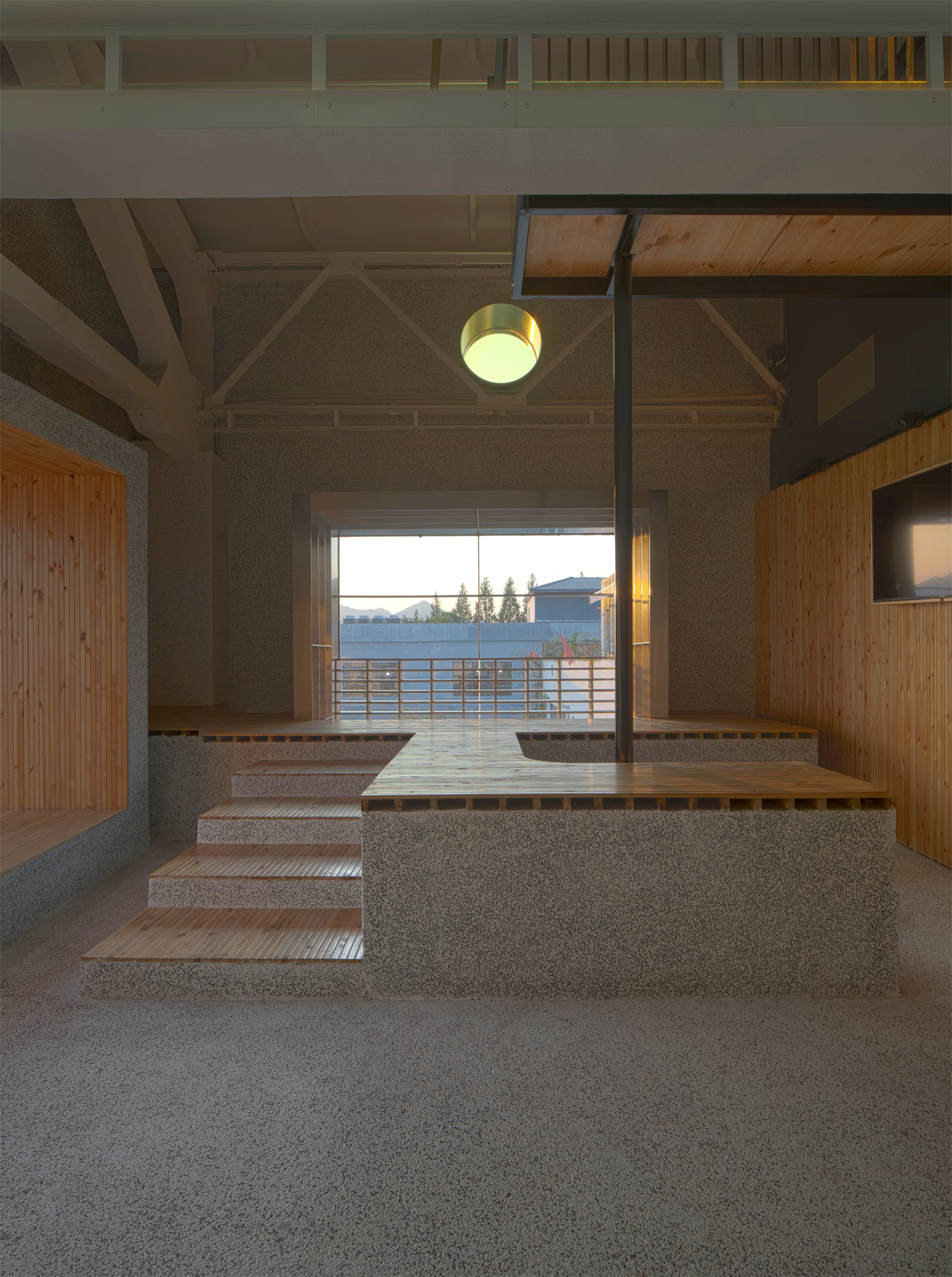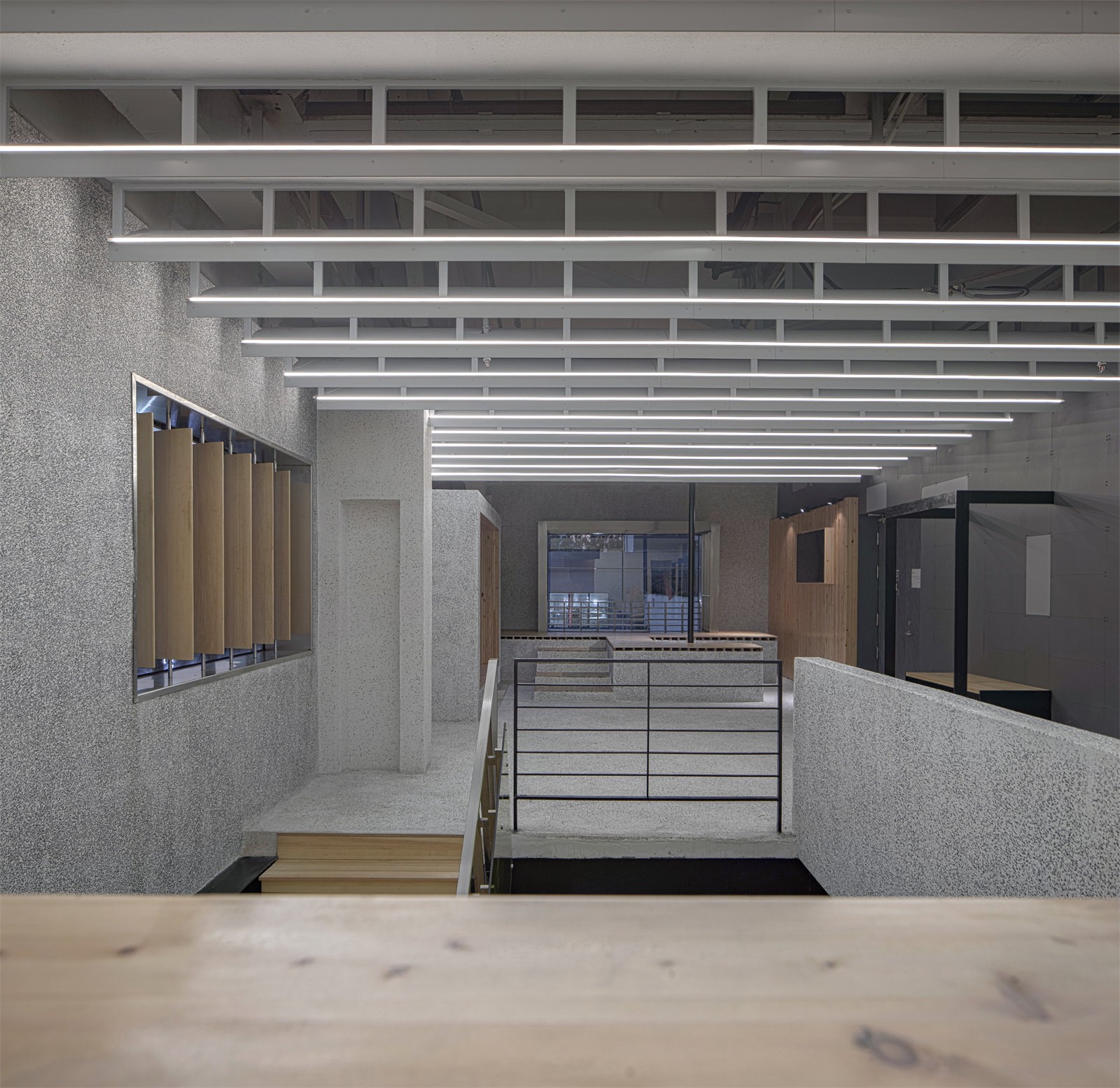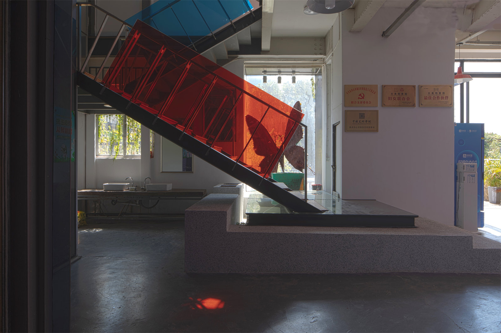 當風景被分解與分析,細微的感受就產生了。日光進入建筑后,發(fā)生了折射與反射,與物相融合,彼此消解。造訪者從室外小劇場進入大樓,通過原有鋼樓梯步行到3樓,最后徑直走向“追光舞臺”,側界面不同顏色的半透界面隱喻了光之分解,界面在不同時段有觸感和色溫的微弱差別,呈現(xiàn)出隱逸的美感。