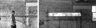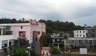 四月底去現(xiàn)場踏勘的時候,正是傍晚,日落時分,走上三樓,屋內雖一片狼藉,但是盡頭酒紅色的光卻穿透窗戶直射到我眼里。一瞬間,我被這光輝吸引。走近看,遠處連綿的山脈與夕陽共同形成一幅長卷。
