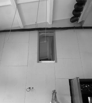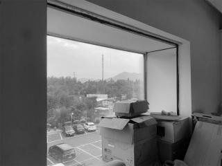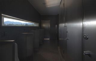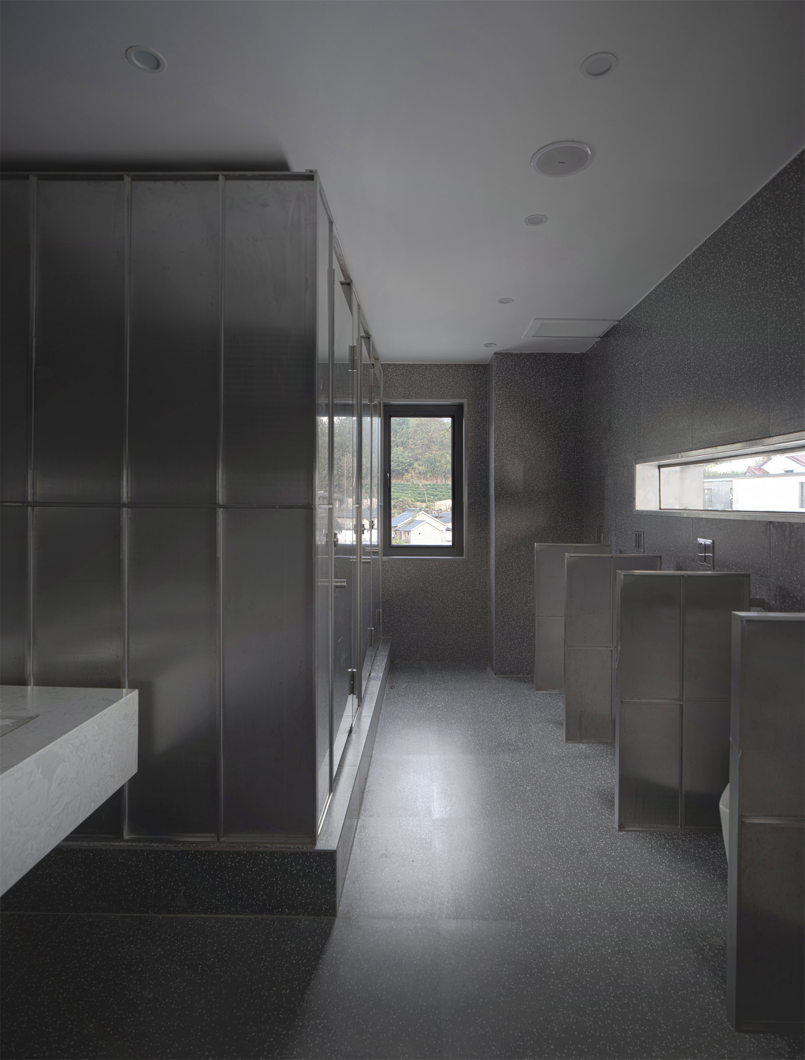 除了基礎包間的設計之外,我還希望男生在如廁時能看到遠處的山脈,這是一種不常有的神奇體驗,為了實現(xiàn)這個動作,我們在原有墻體的人視高位置開了3.2米的橫向長窗,當開洞完成后,光線噴涌而入,遠山驟然出現(xiàn)在這個狹小陰暗的房間內,形成一幅長卷。