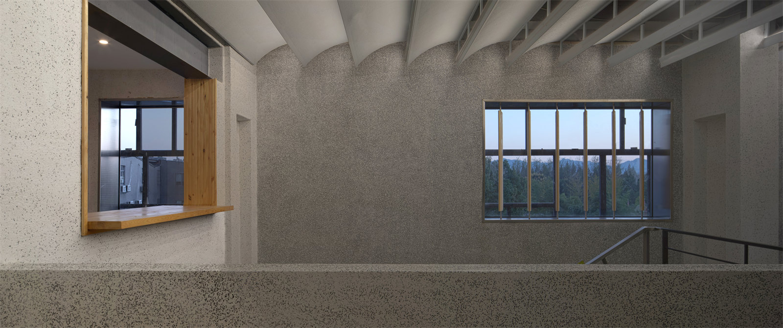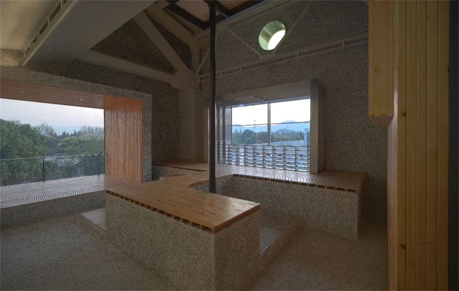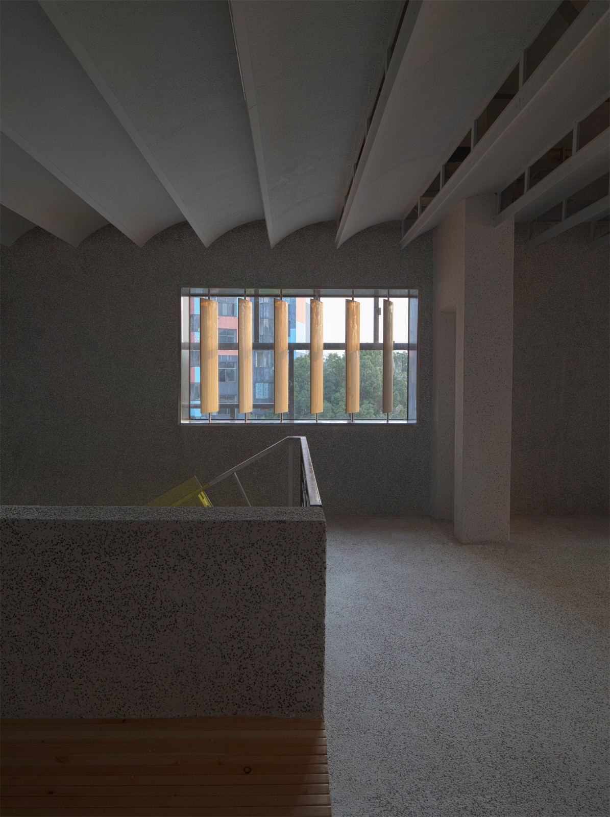 前廳的頂部被混凝土桁架所支撐,最高處層高有6.8米,上部主要是管線,我把室內西側上部的墻打開,一條空中走道徑直穿出,在夕陽下承接透過圓窗的金色光斑,這是整個空間體驗的高潮,我稱之為“追光舞臺”。