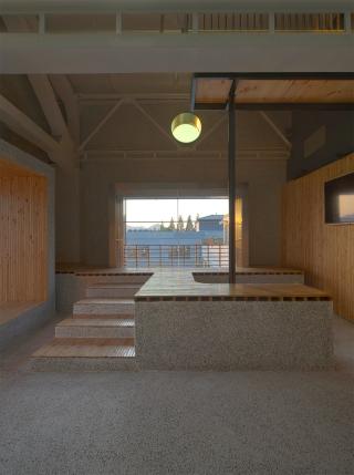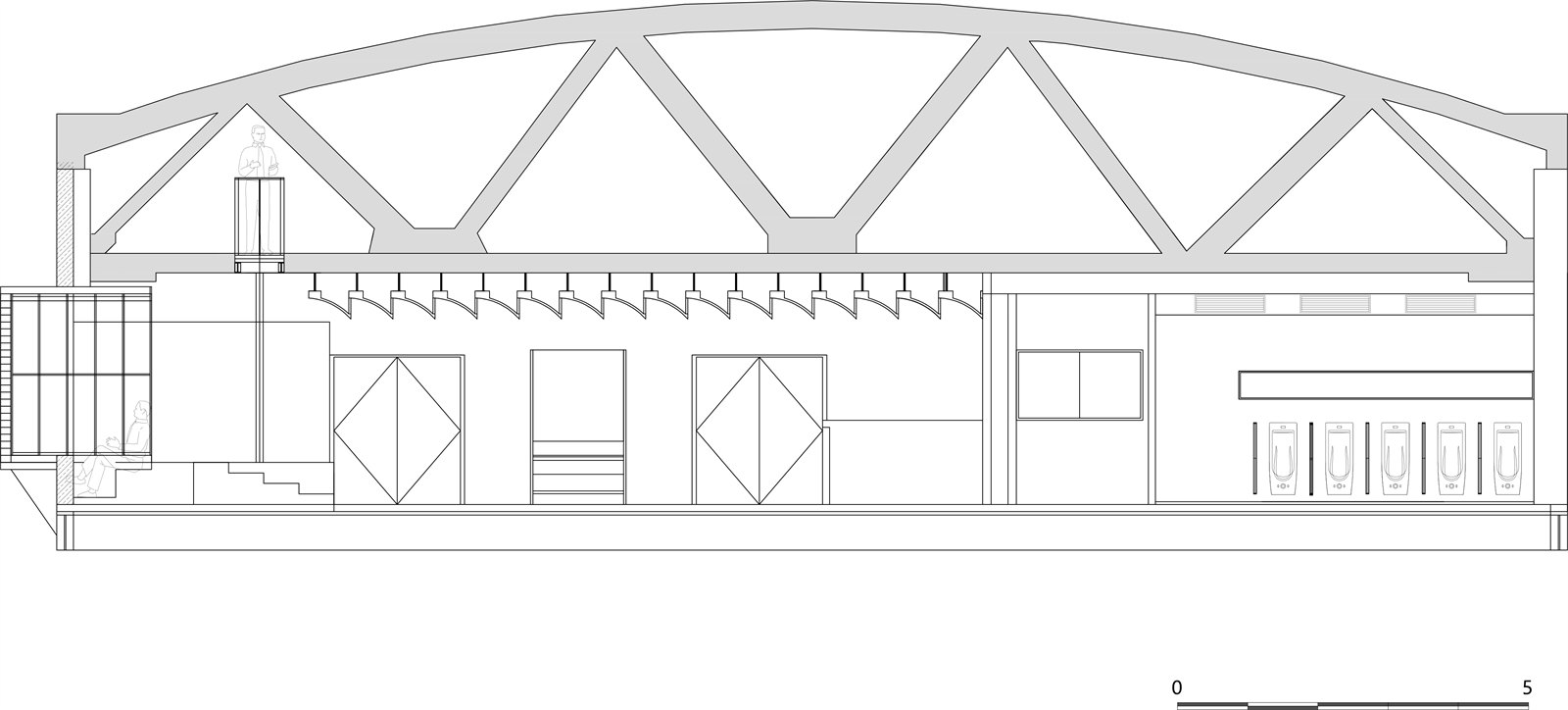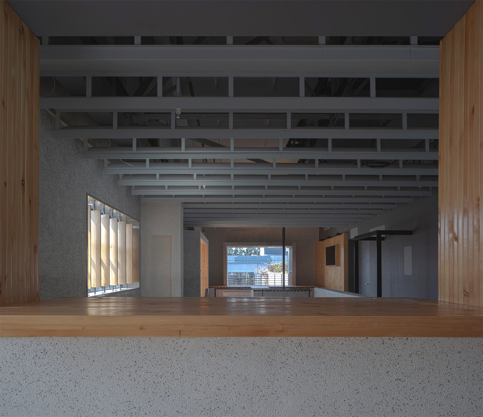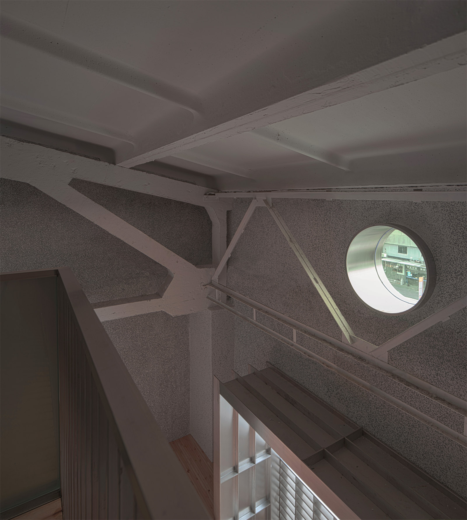 前廳的頂部被混凝土桁架所支撐,最高處層高有6.8米,上部主要是管線,我把室內西側上部的墻打開,一條空中走道徑直穿出,在夕陽下承接透過圓窗的金色光斑,這是整個空間體驗的高潮,我稱之為“追光舞臺”。
