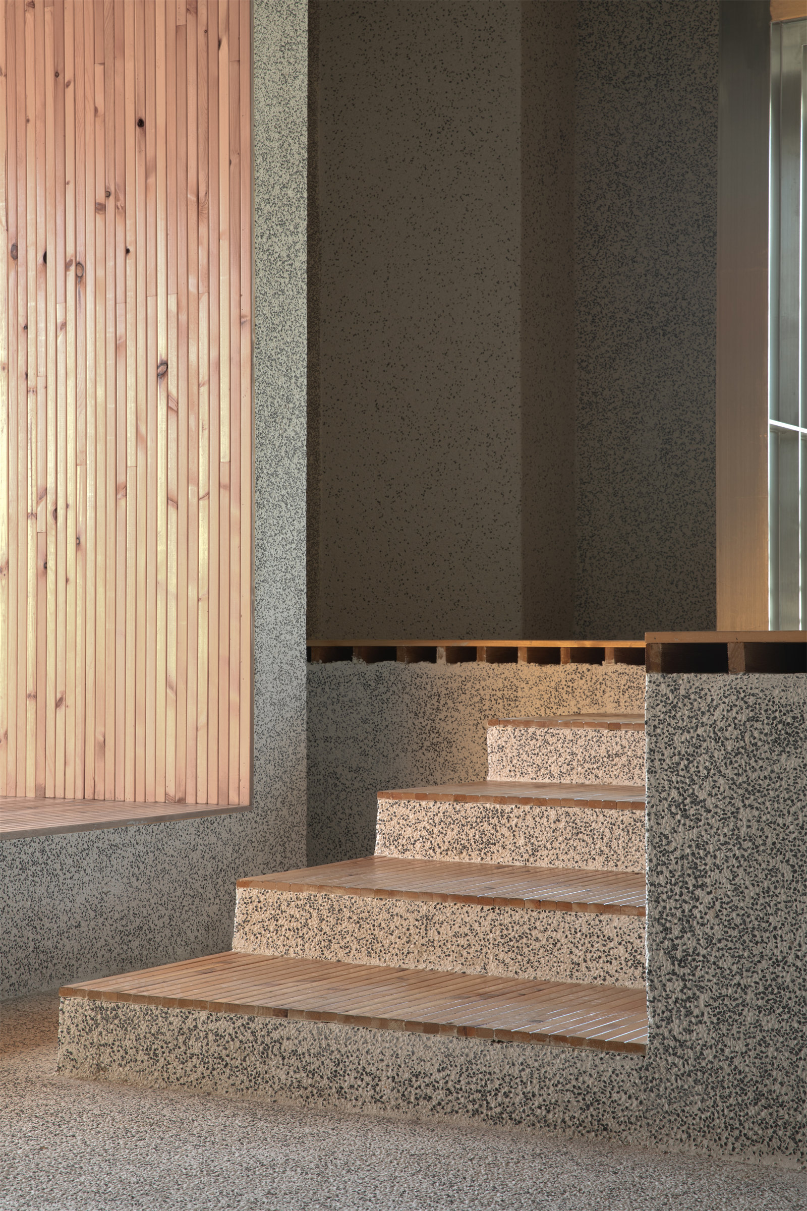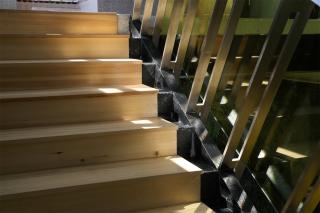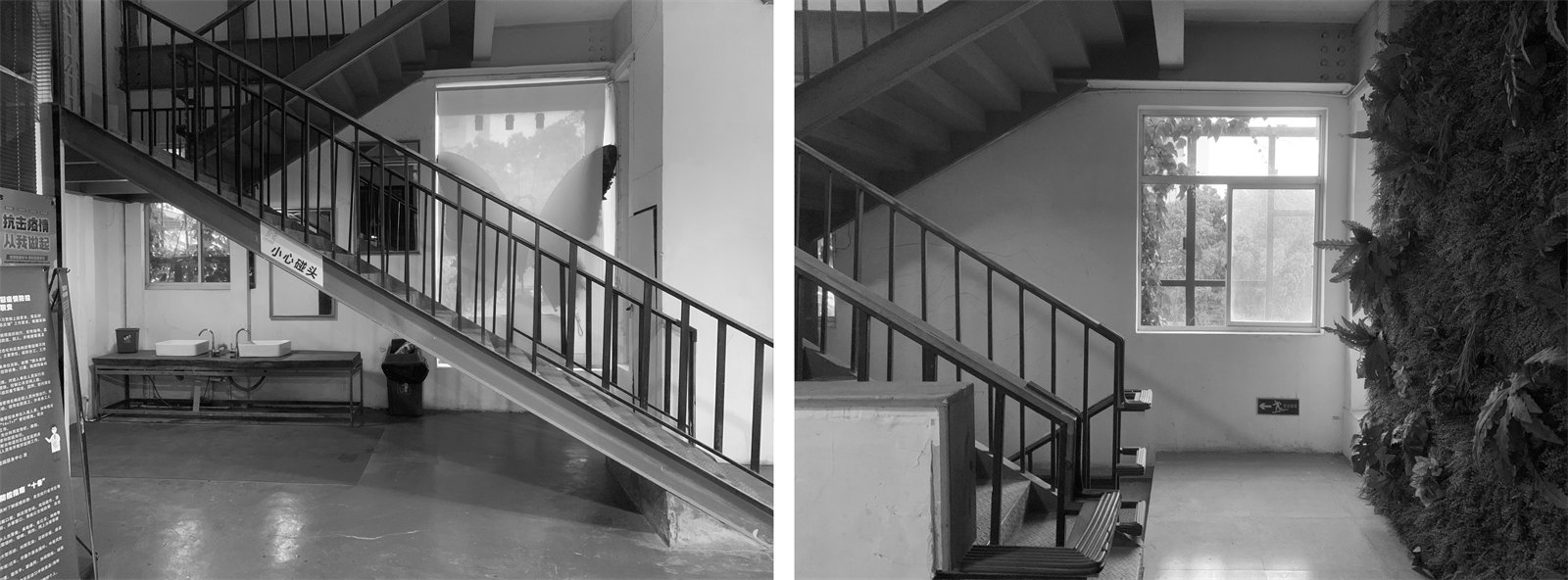 其二是踏面基層涂刷黑色保護漆,以木質面層覆蓋在銹蝕的鋼踏步表面,兩段各留出15厘米,讓人得以看見原有的踏步;
