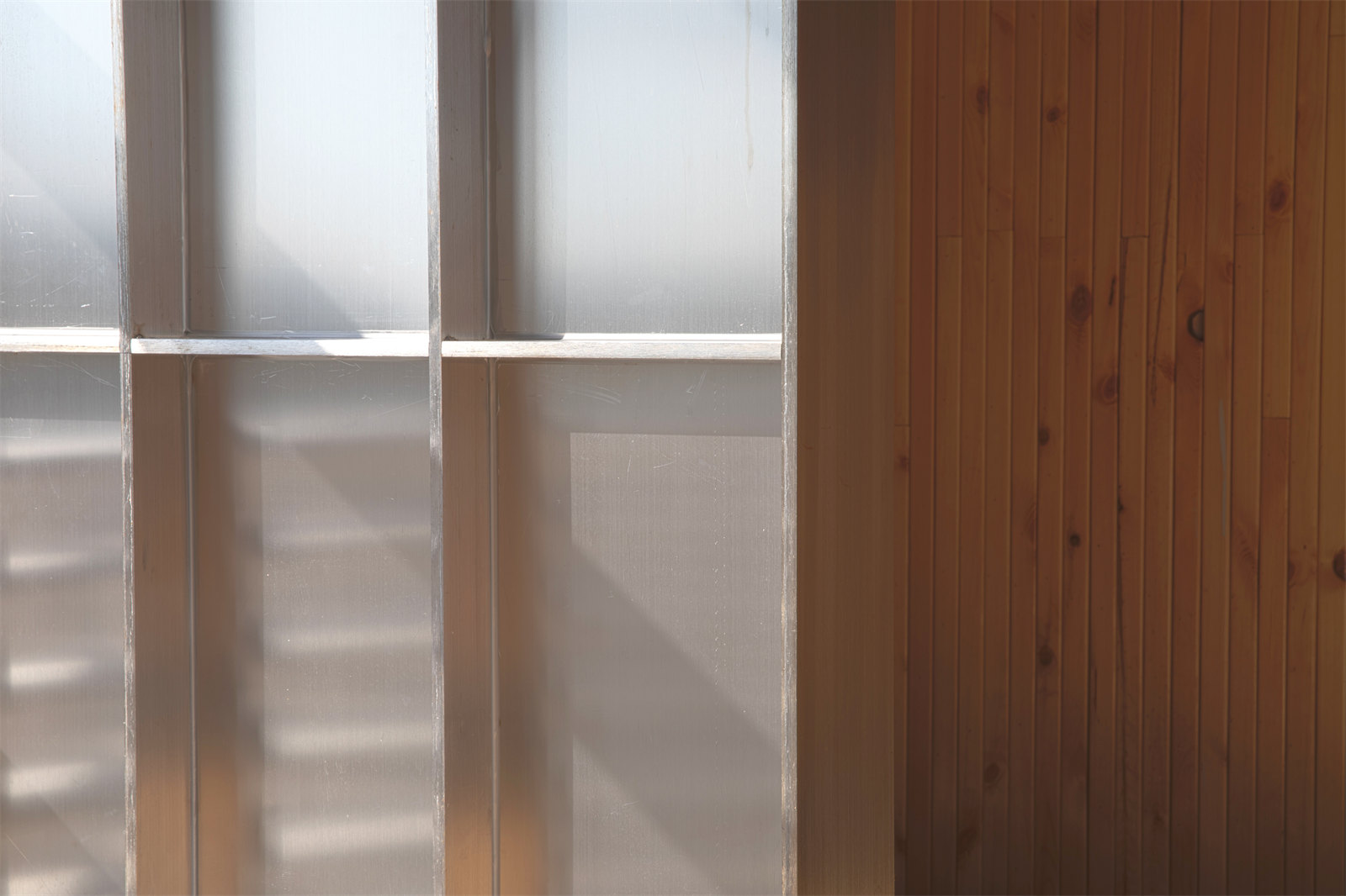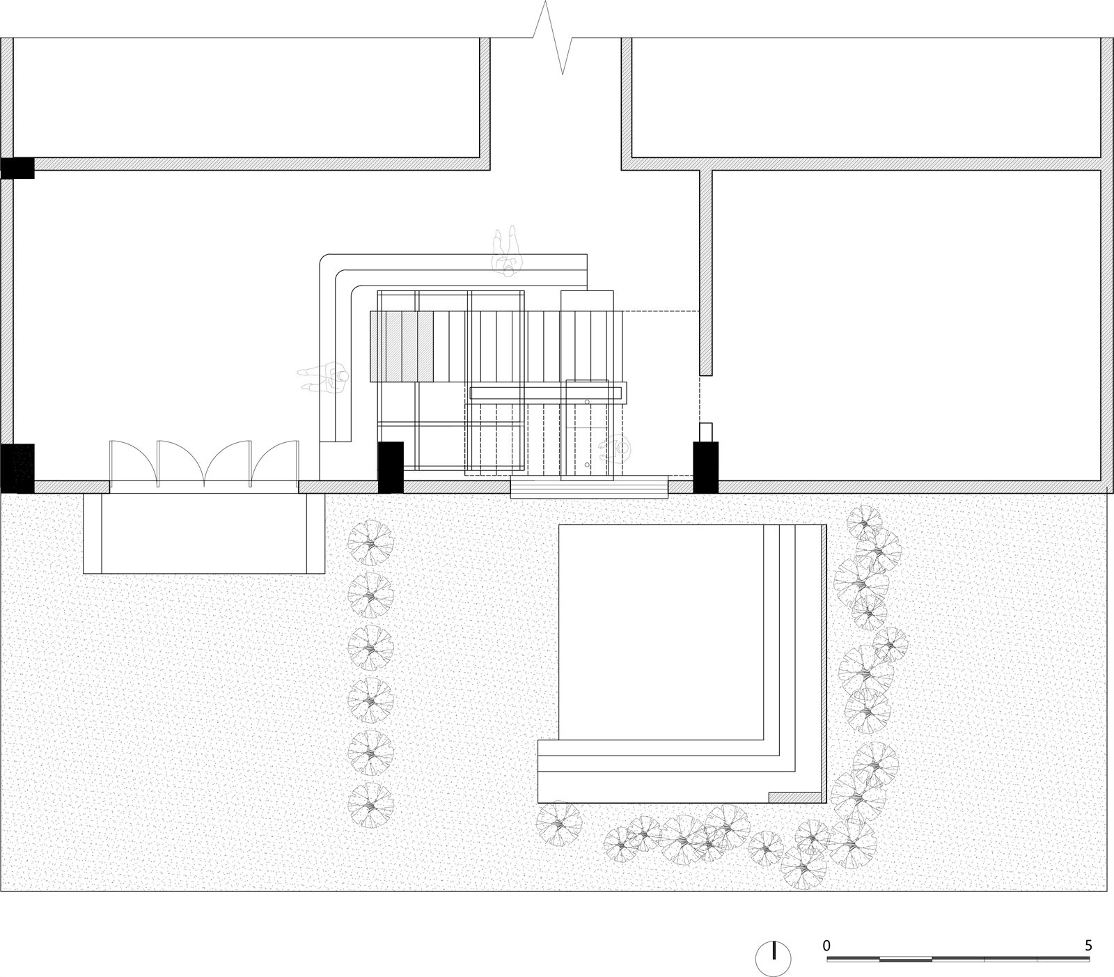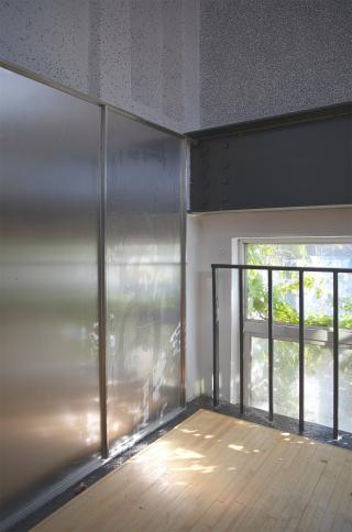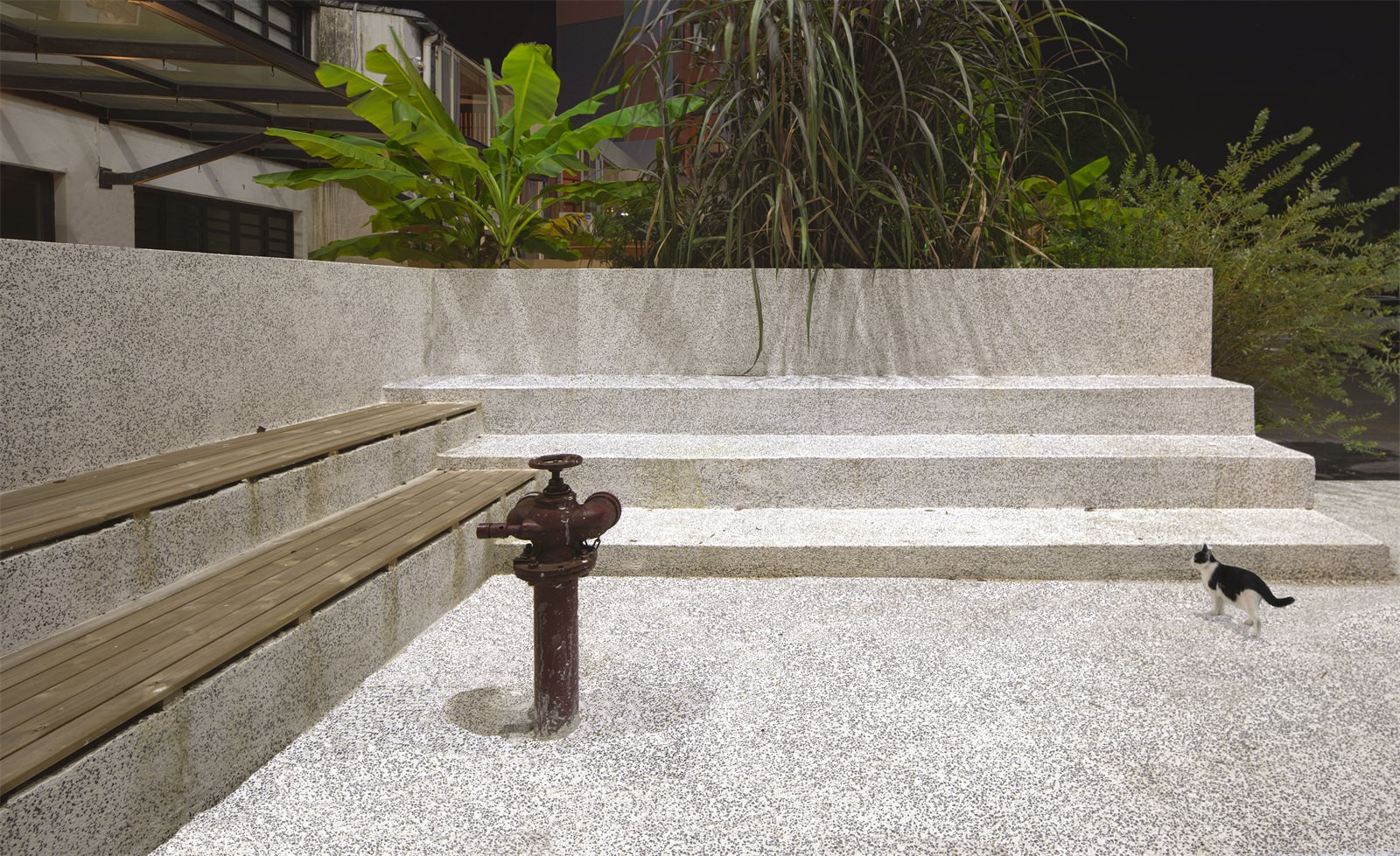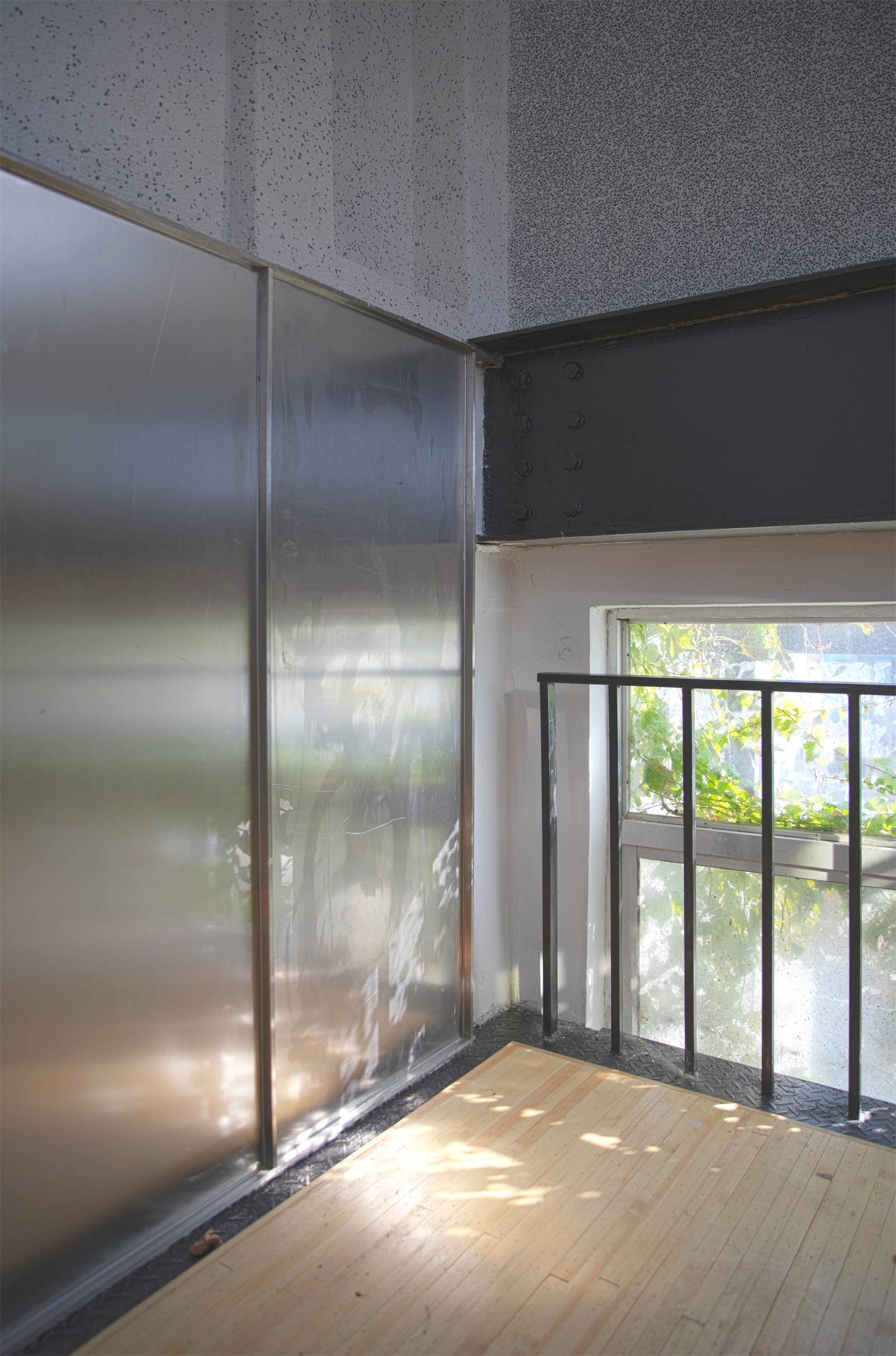 新舊悖論存在于改造項目的處處細節(jié),入口的鋼樓梯由于建造日久,表面已經(jīng)銹蝕,我們做了三個動作:其一是圍合并擴大了前四步臺階的范圍,形成休憩空間,這四步臺階圍合了舊有的4步踏步,并將其包裹在內,其上以鋼結構和鋼化玻璃覆蓋,走上新臺階的同時可以窺見腳下的舊臺階;
