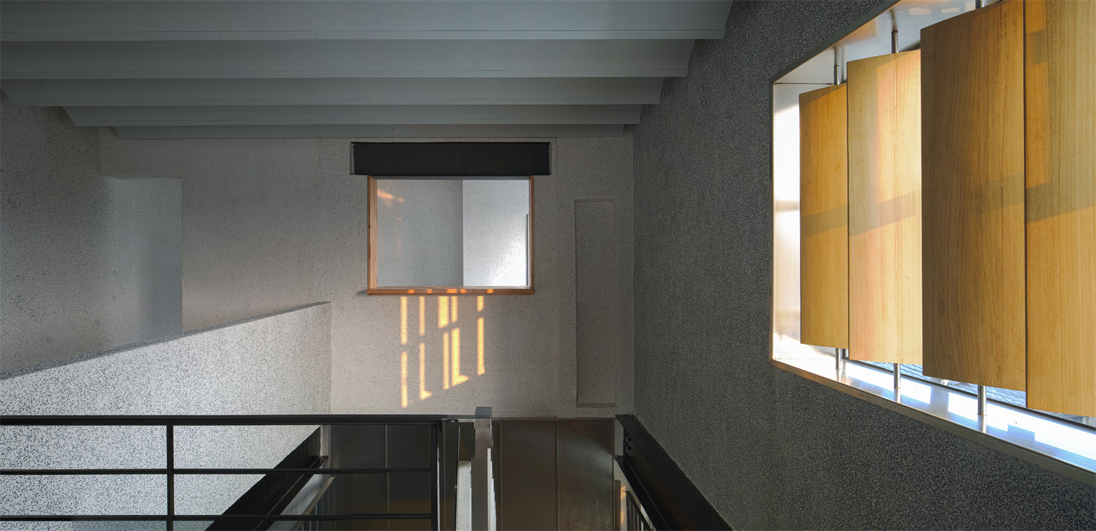 ▼改造后的樓梯平臺:新舊界面在陽光下交融對話