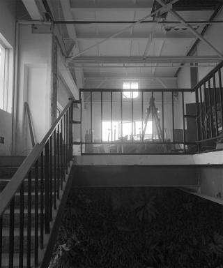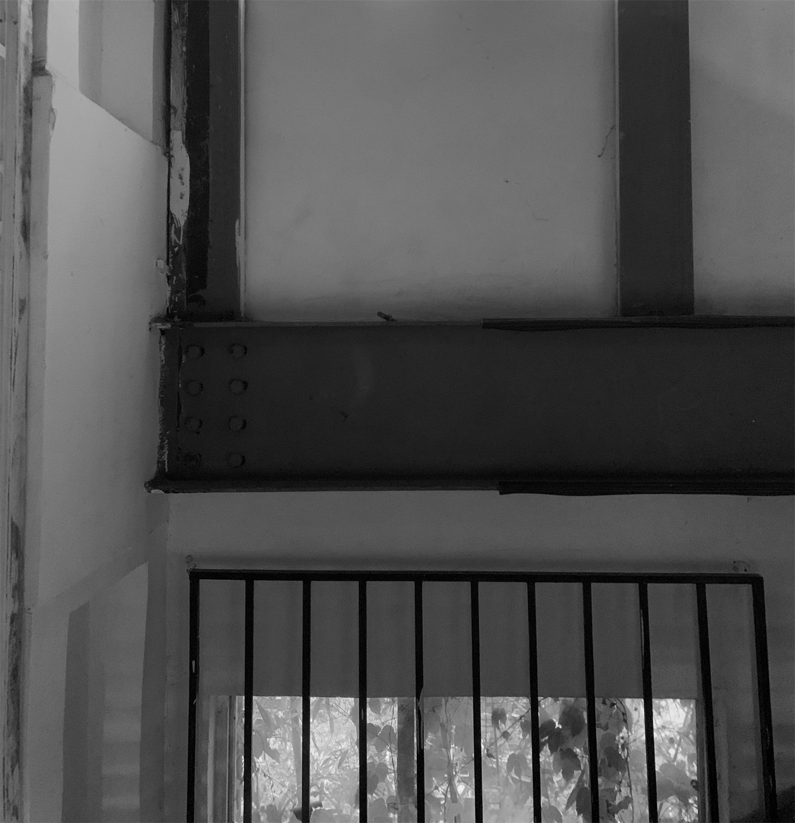 ▼改造前的樓梯平臺:內有工字鋼梁混凝土柱的厚重框架,承接陽光的界面破碎銹蝕