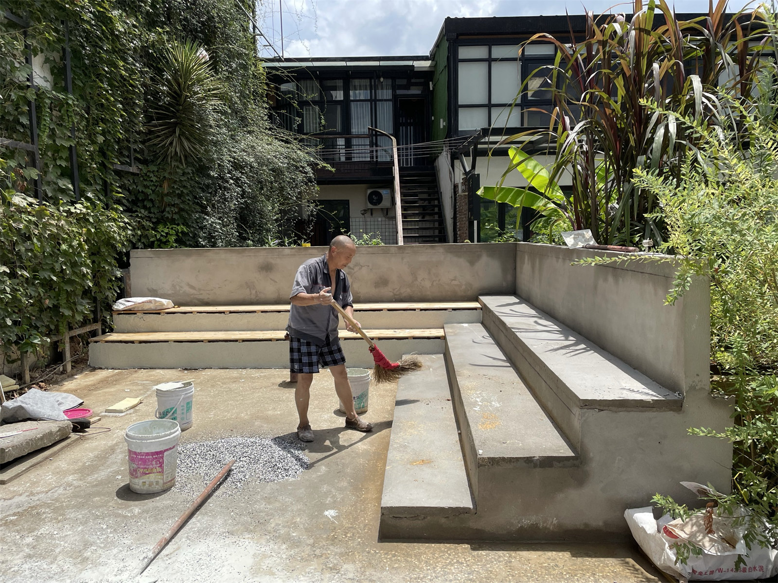 設計在材質的使用上是克制的,以不同黑白配比的水洗石作為基礎面層,石頭的粒徑在5-8mm之間,黑白配比分為3:7,5:5,9:1等三種,靠近劇場入口的鋼板亦是黑白相間,設計以黑白粒子化的基層作為空間載體,來回應外部風景的斑斕。