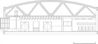 在管線密布處,我沒有選擇將吊頂做成一個實體的面,而是將其設計成16片弧形板,板的側面是透的,依稀可見上部的機械痕跡。