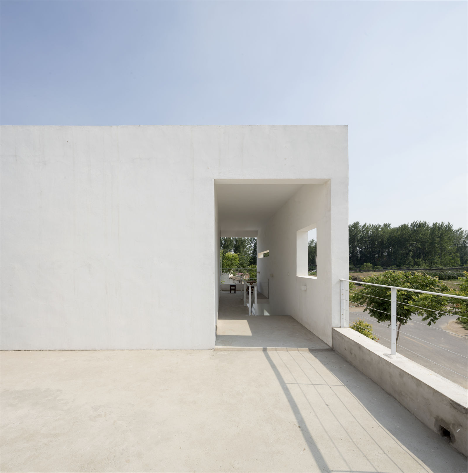 二層西側(cè)的大平臺(tái)則連接著一望無(wú)際的田野。亭子、客廳、臥室,三個(gè)體量分別占據(jù)南面,西面,北面,形成對(duì)內(nèi)部庭園的夾持。