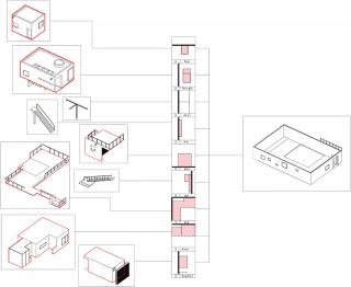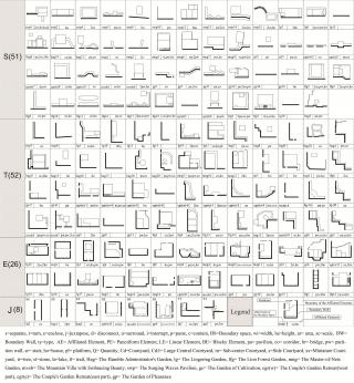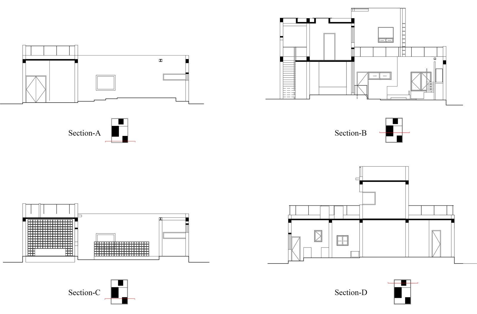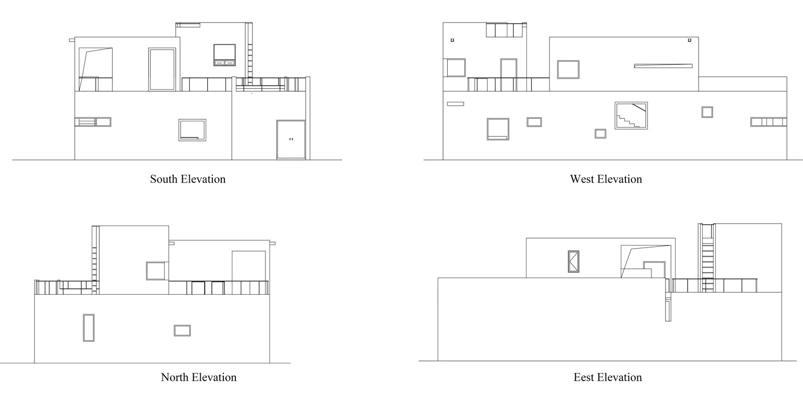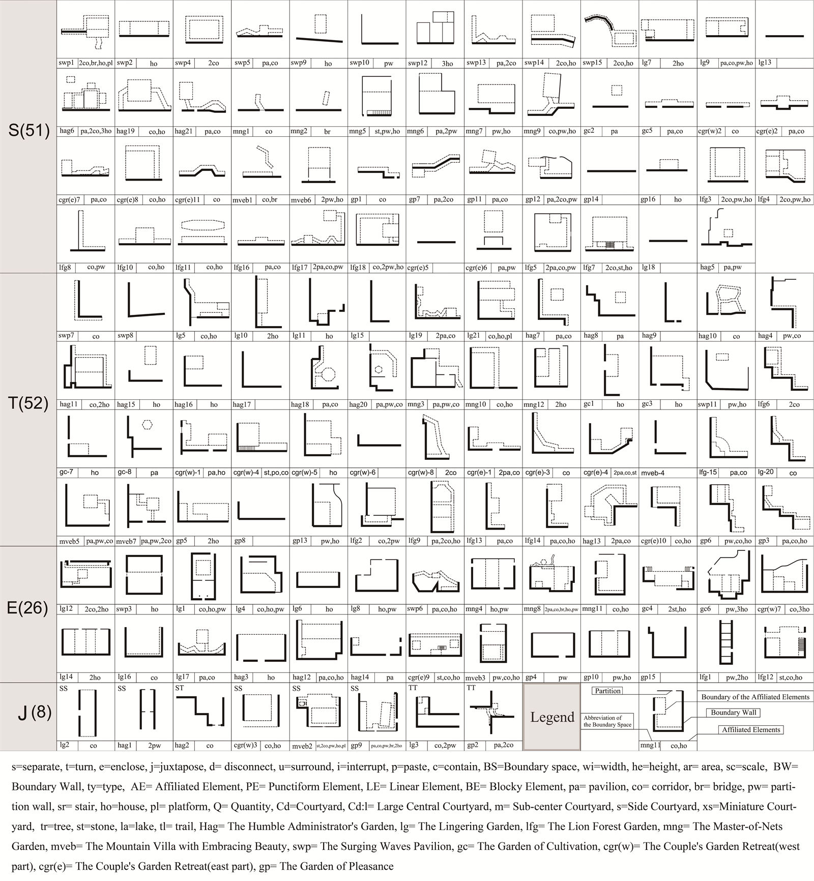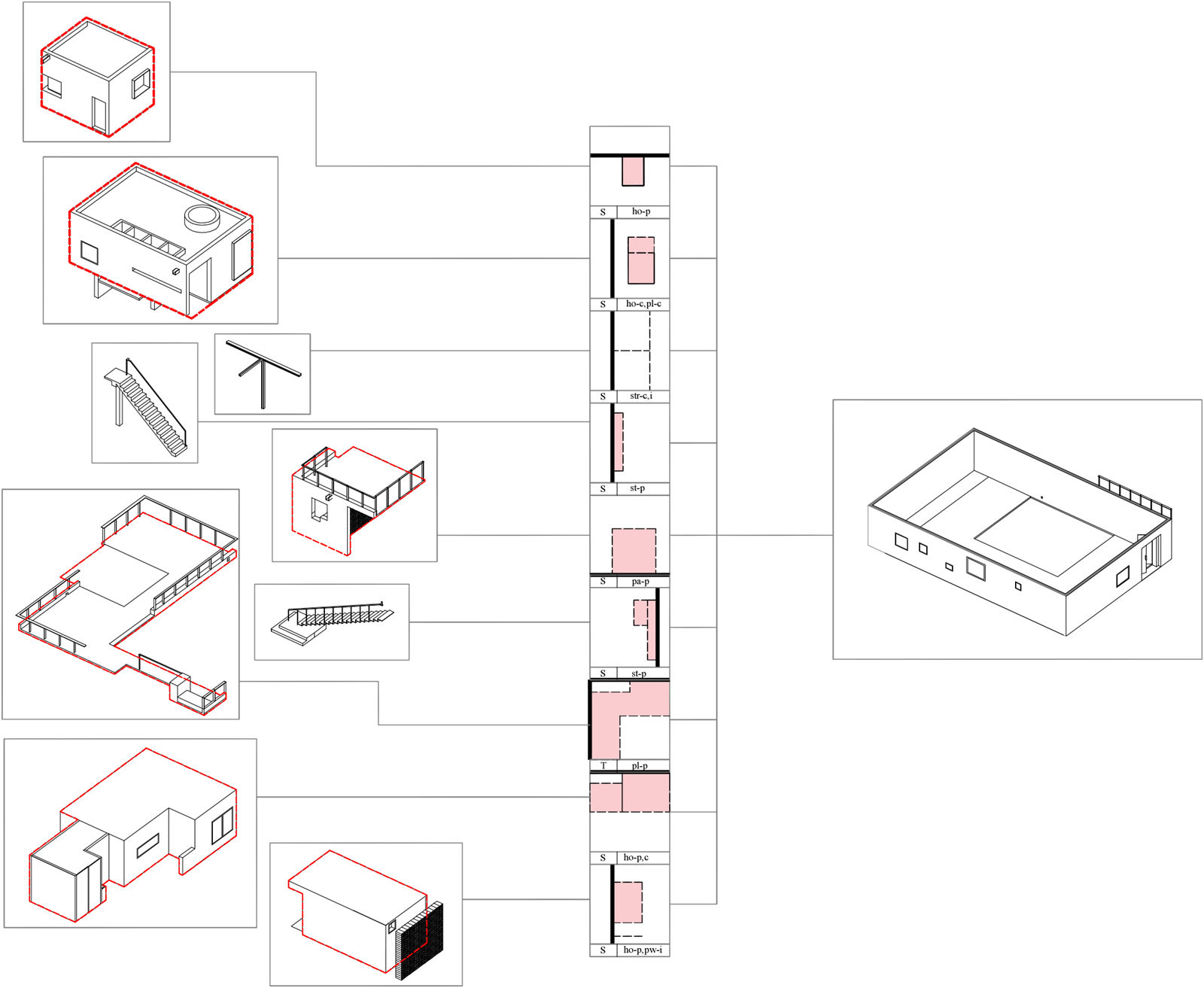 以類型學(xué)的方式考量,在邊界空間中,形體與圍墻產(chǎn)生了九種空間關(guān)系,類比中國(guó)傳統(tǒng)住宅對(duì)于邊界墻體的處理,此處的九種類型分別是:房間與圍墻的貼合與包含,樓梯與圍墻的貼合,平臺(tái)與圍墻的貼合,鋼架與圍墻的包含與打斷。其中鋼架與圍墻的抽象關(guān)系較少出現(xiàn)在中國(guó)傳統(tǒng)住宅中,類似構(gòu)造在拙政園卅六鴛鴦館北側(cè)廊架和留園北側(cè)又一村廊架中出現(xiàn),只是他們是連續(xù)的,線性的,此處則強(qiáng)調(diào)空間轉(zhuǎn)折時(shí)的過(guò)渡。