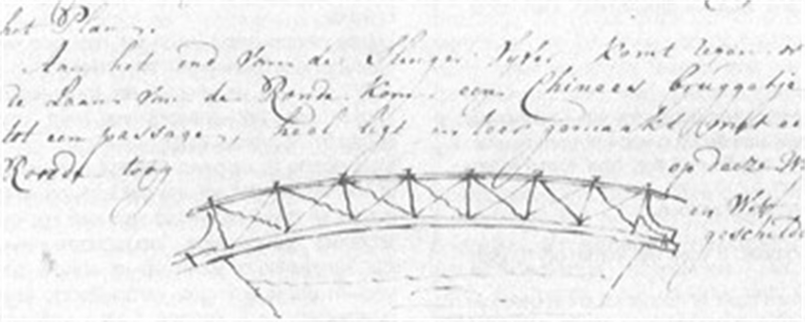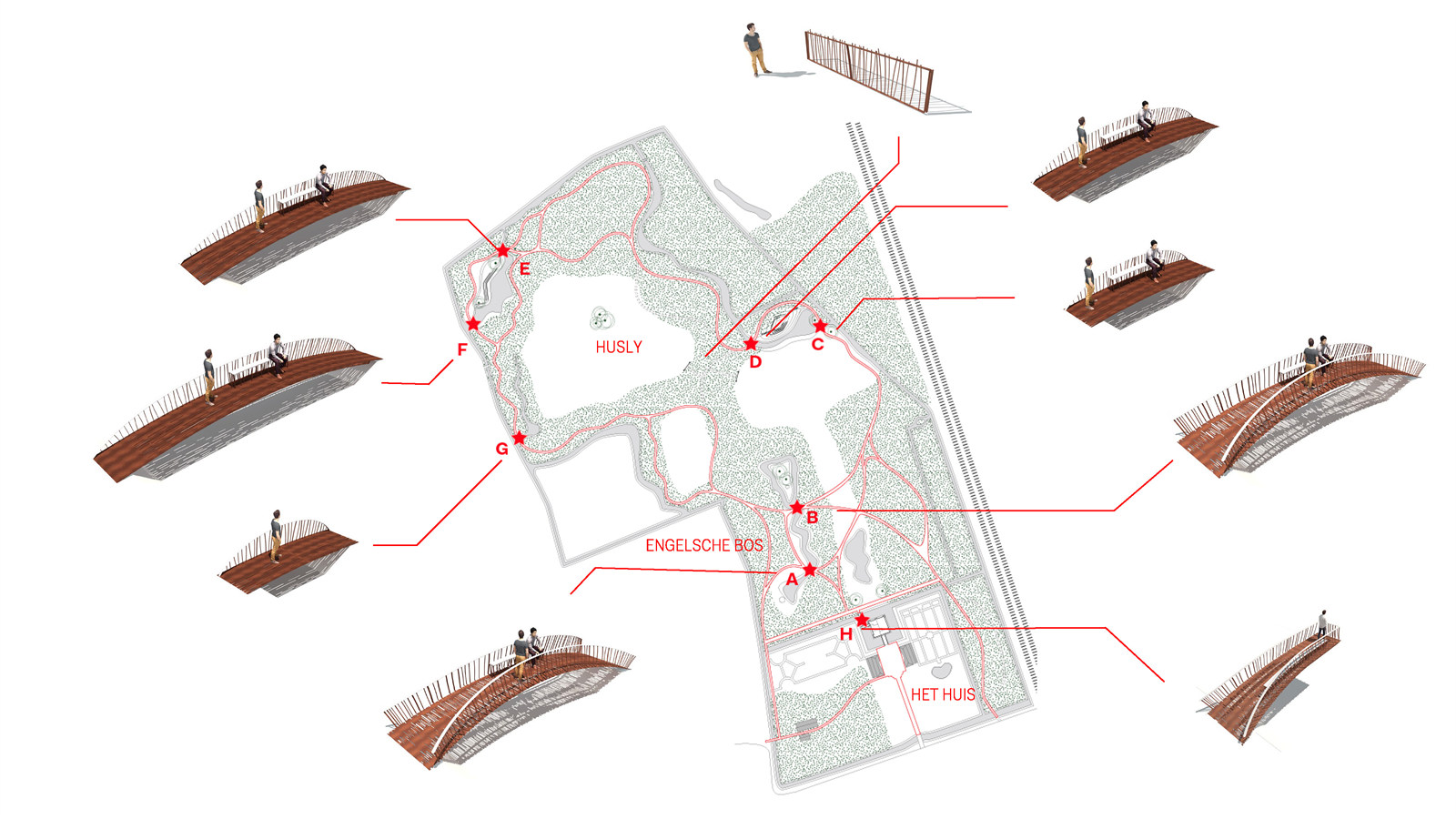 The new bridges are designed with a modern vision and contemporary means but in the spirit of the historic estate. The location of the original bridges is known and a hand drawn sketch by Husly shows his intention for the design. However, it is not known whether all the bridges were actually built or whether the overall design was similar to the sketch. For this reason, a new design was made that matches the specific location of the various bridges in Husly's plan. Together the bridges form a family, although each bridge has its own unique elements. For example, the arches of the bridges vary in height. In addition, a fence with the same characteristics has been designed.