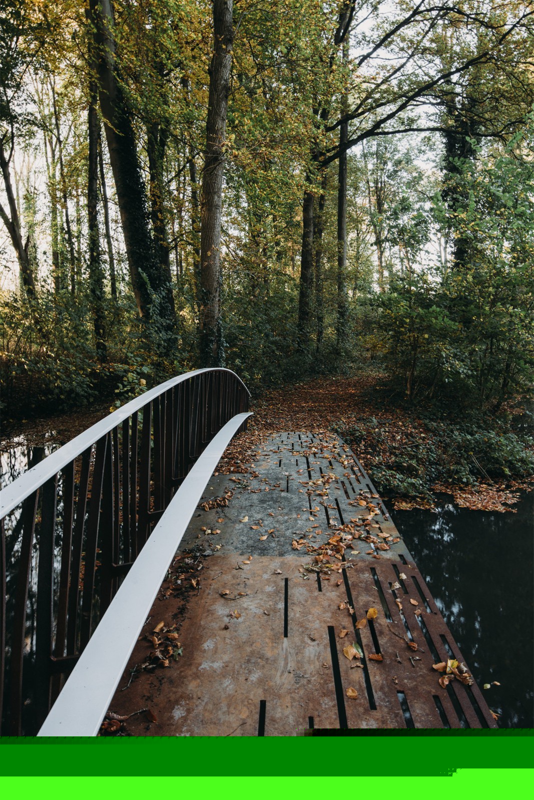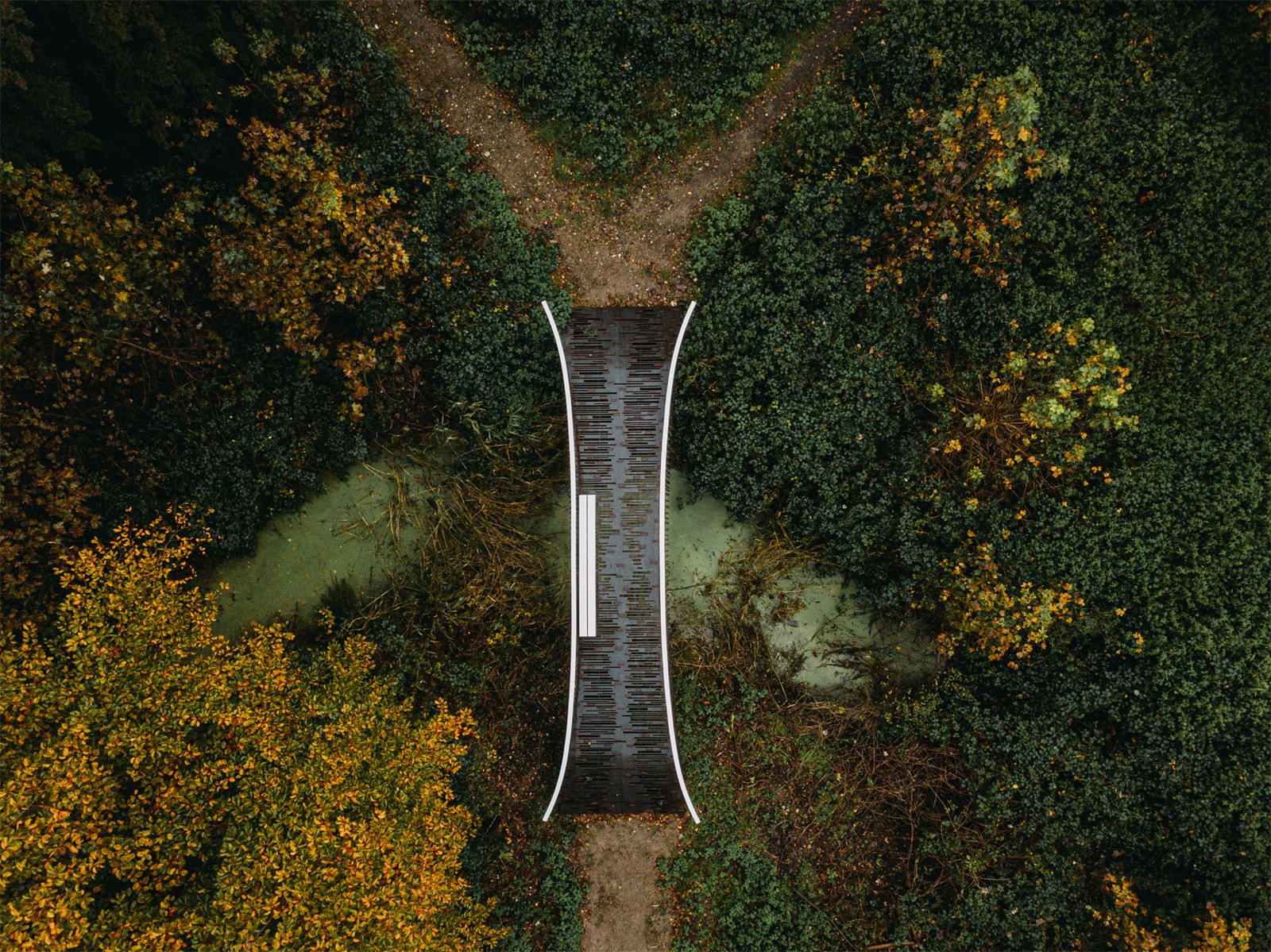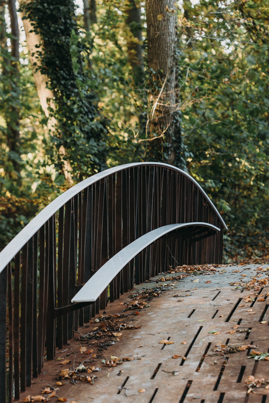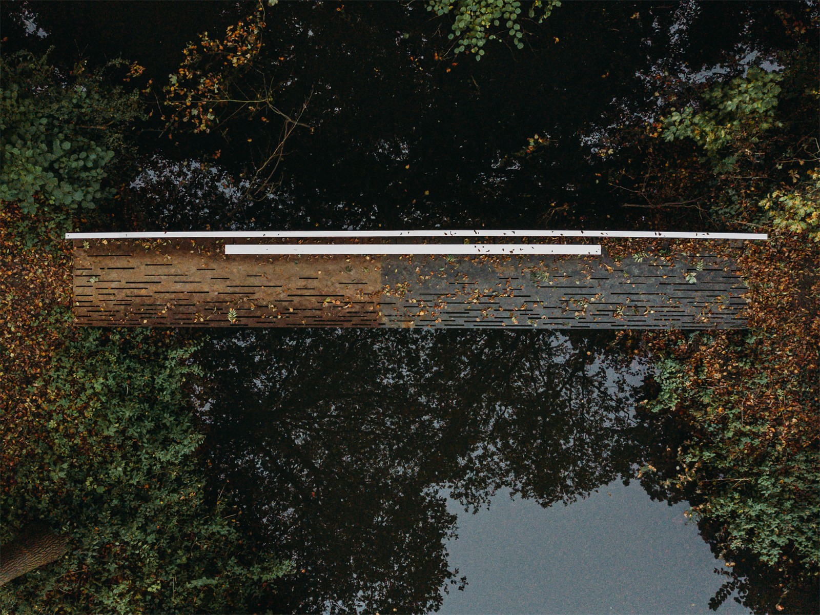 By using Corten steel, the bridges appear and disappear in the landscape. On the one hand, the brown rust colour of the material blends in seamlessly with the forest, but on the other hand, the material is fairly rough and sharp, which offers a contrast with its environment. The white railings reinforce that contrast and accentuate the bridges and their leading lines. The deck features a perforated pattern that is based on a bridge constructed from wooden slats. The slits in the deck offer a small view of the water and emphasise the seamless integration of the new connections in the Windesheim estate.