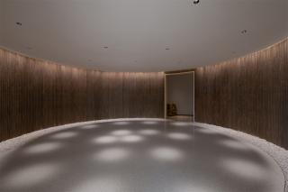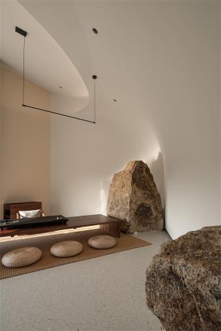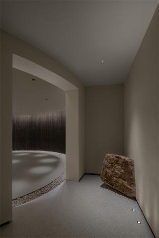Two independent spaces are arranged on both sides of the reading area: VIP tea room and rest rooms. The VIP tea room is an introspective space. The interior continues the simple style, with tea tables and seats, which can be used for solitude or for talks. The room is specially decorated with an original stone. Sitting while facing the stone, you can also have a close view of the beauty of mountain and stone while reading and drinking tea. For the rest rooms, a dramatic effect is specially created, and the contrast colors and optical fiber device both give people physical hints.