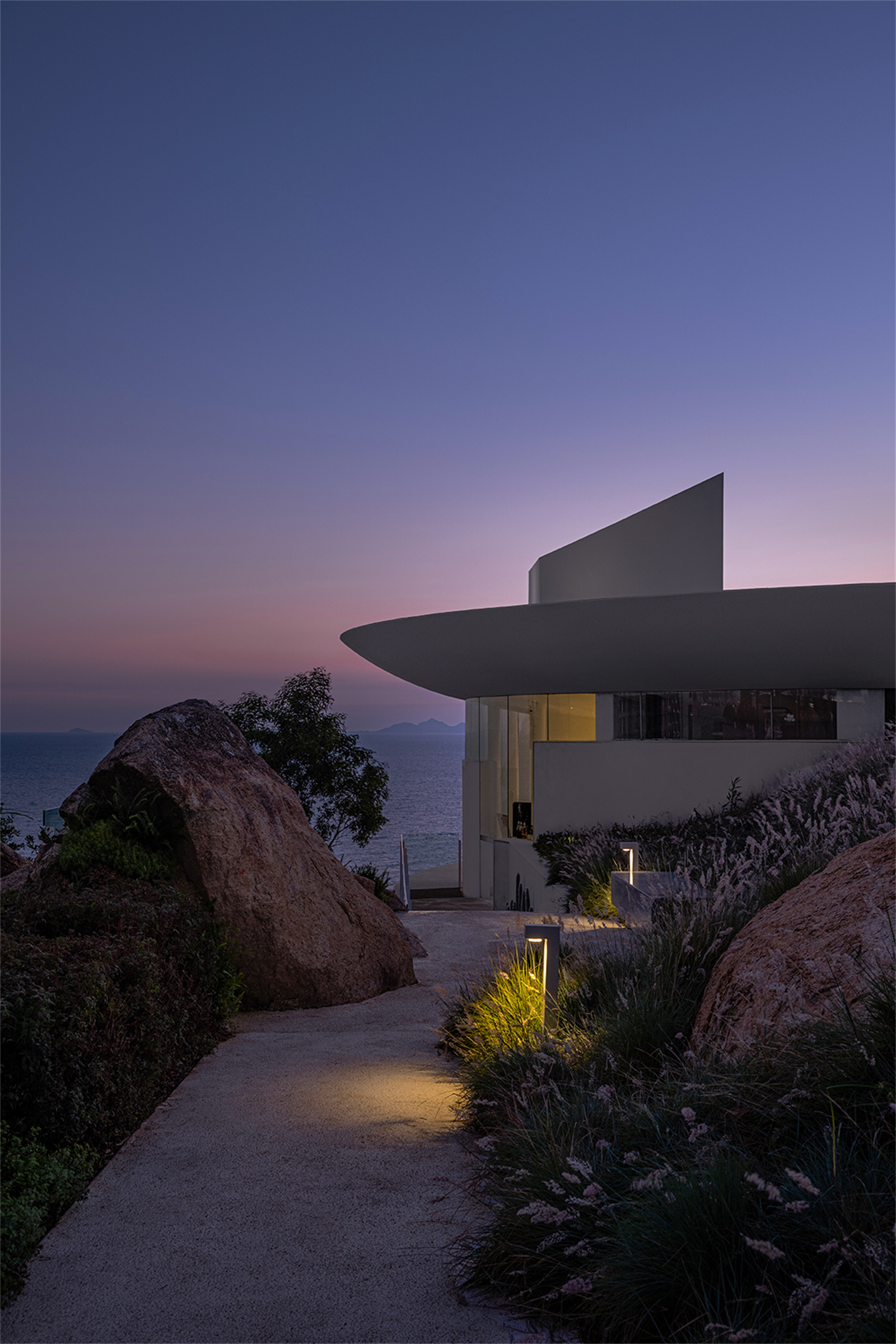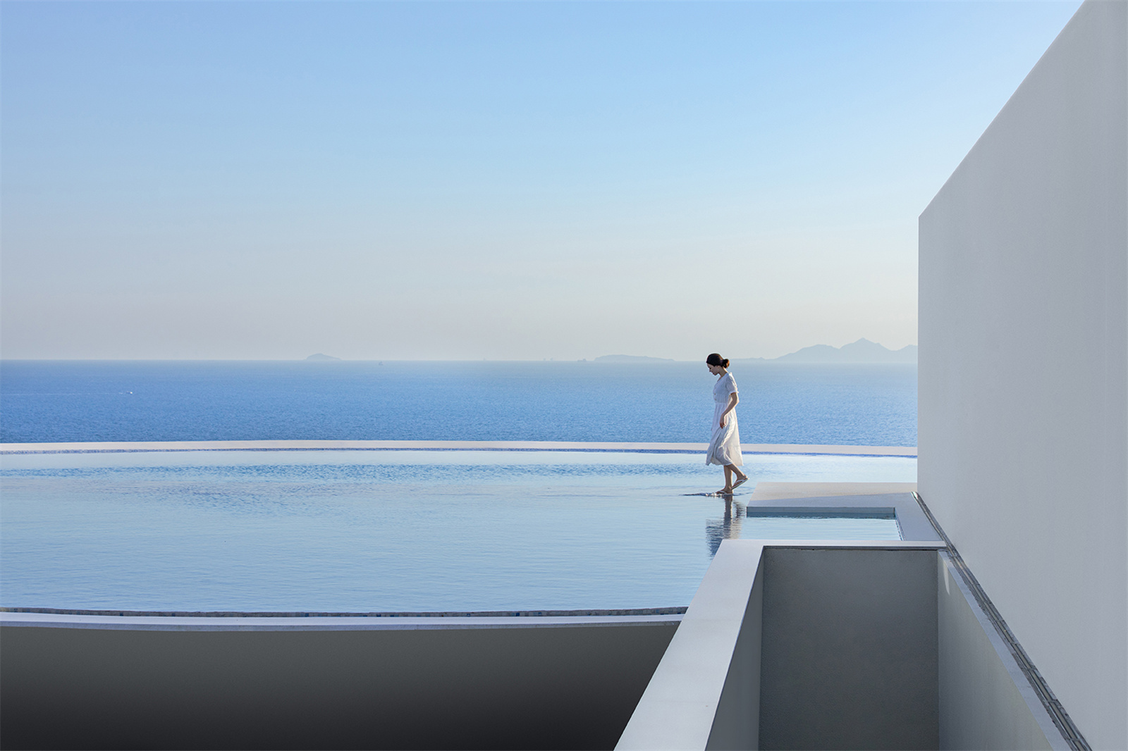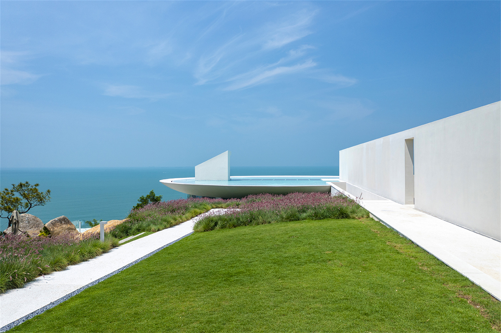 At the top of the hill, the white corridor and long wall become artifacts in the natural landscape. The pure geometric shapes well attract the attention of users and lead people to the direction of the roof pool and the sea.