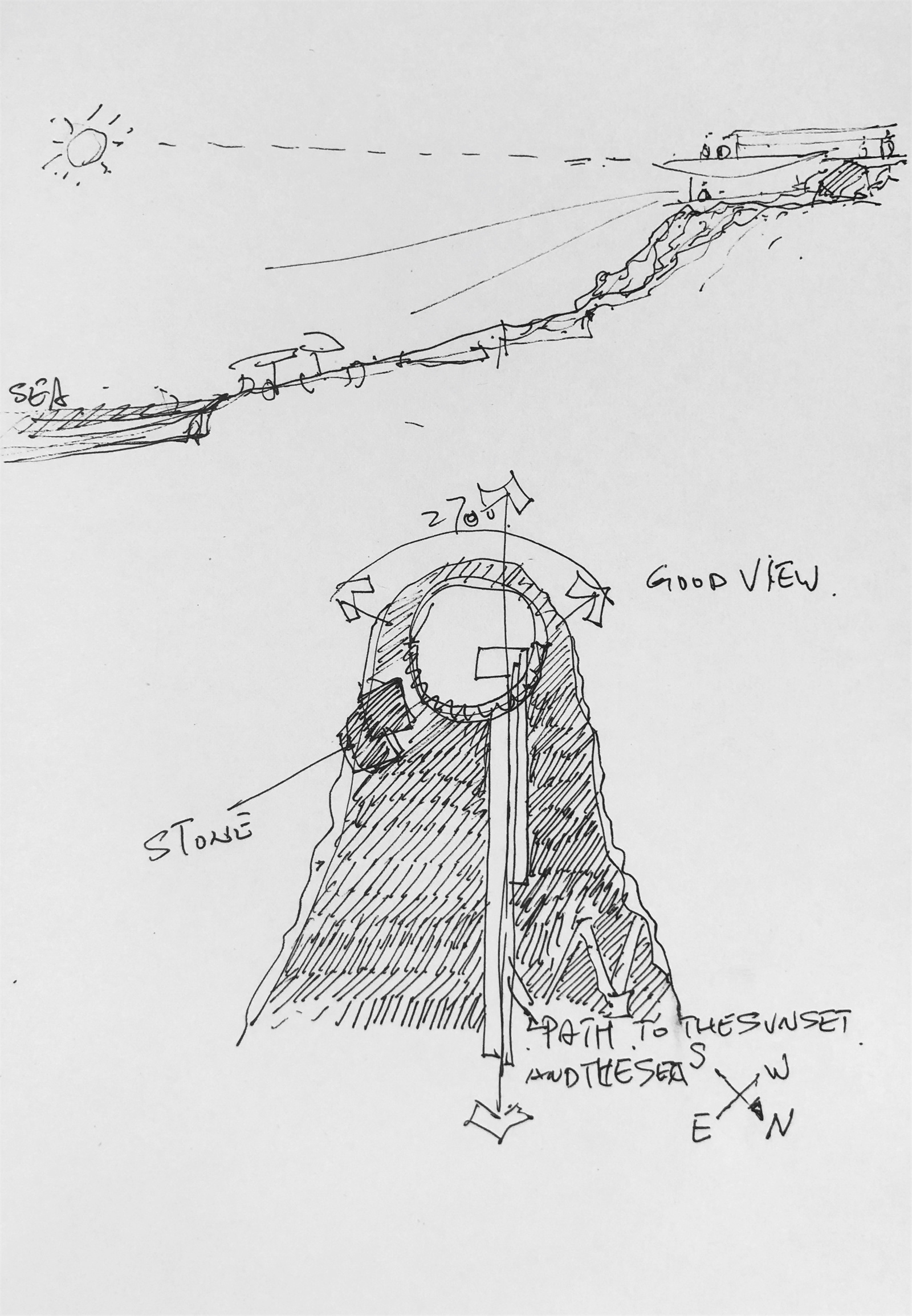 建筑位于廣東惠州市平海鎮(zhèn)雙月灣中央公園內(nèi)。公園在平海古鎮(zhèn)和大海之間,距離著名的雙月灣海龜保護區(qū)不遠。公園整體地形北高南低,北側(cè)有丘陵和谷地,向南是大海。項目基地靠近公園中心,是一座獨立突出的“半島形”小山。山的走向從東北向西南,因此北面的視野以山丘和谷地為主,向南則是270度的海景,視線絕佳。公園內(nèi)的山丘形態(tài)柔和,并不奇駿,但有若干巨石,為景觀的塑造提供了重要的依托。