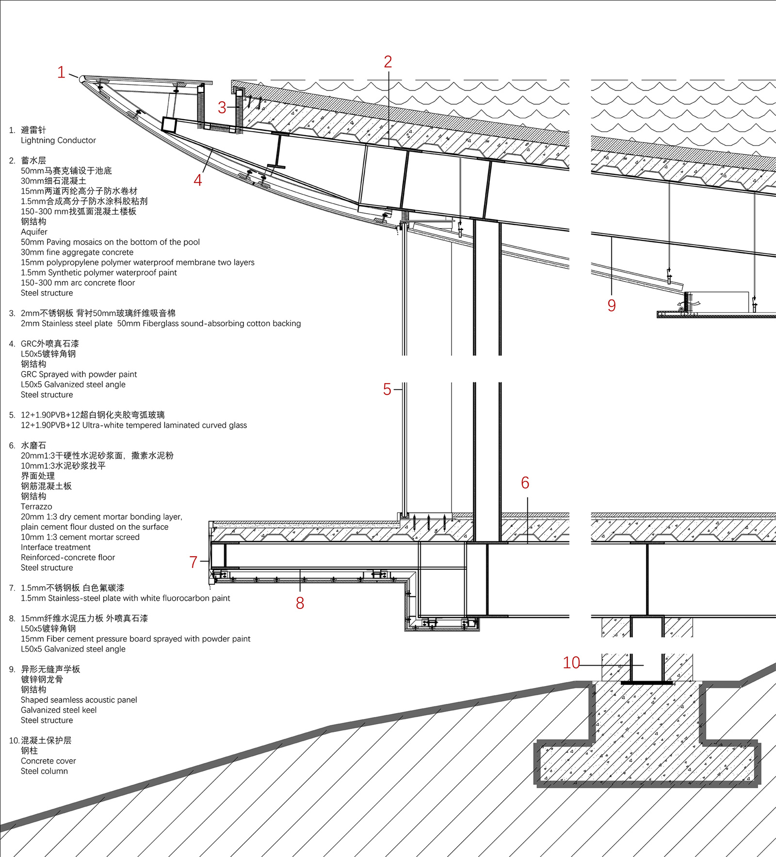 The modeling of the library strives to have poetic tension: looking down from a high place, the building is very geometric - a circle plus a straight line. The plane shape of the main part of the building is circular, and the straight line is the outdoor corridor and long wall, which introduces people from the top of the hill into the building. The whole library is white, and the edges of corridor, long wall and roof strengthen the sense of geometric composition. The section of the building roof is bowl shaped, and the transparent glass in the reading area gives the roof a sense of suspension. Inside the bowl shaped roof is a pool, which gives the building a kind of dramatic implication - an underwater library.
